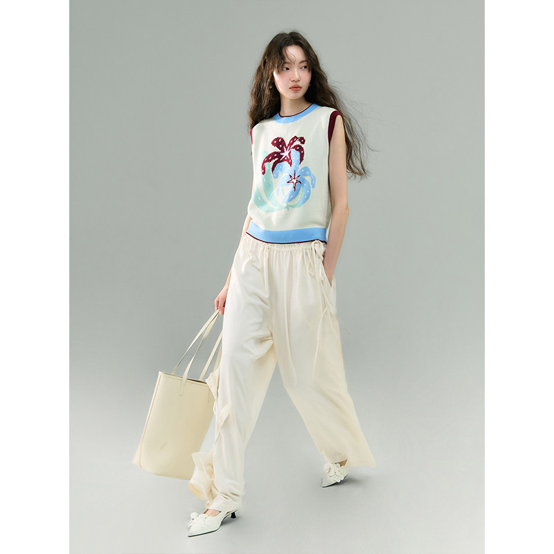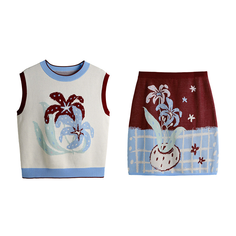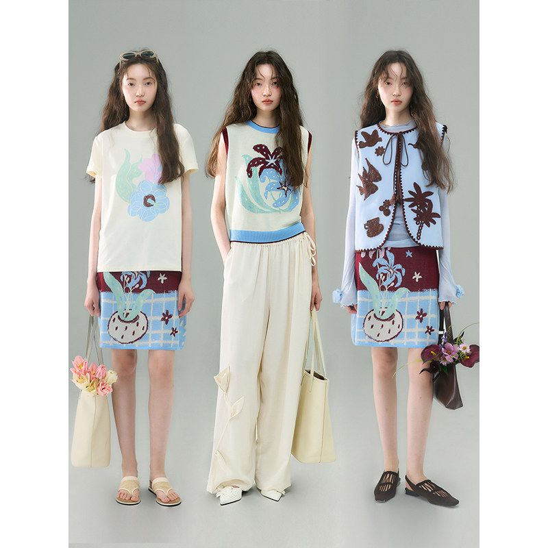 有耳uare原创设计 瓶子里的花 手绘百合提花混天丝背心半身裙套装