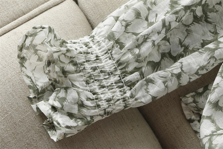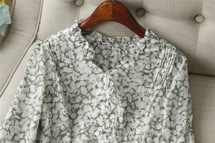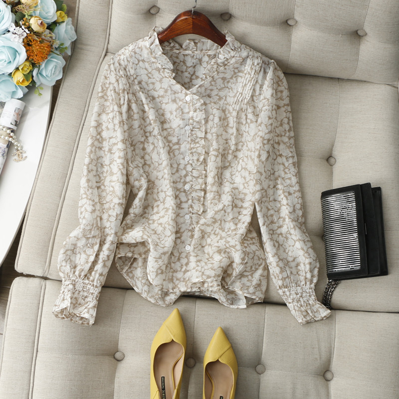 优雅清新~花边木耳V领印花长袖单排扣舒适轻薄天丝防晒衬衫女早秋