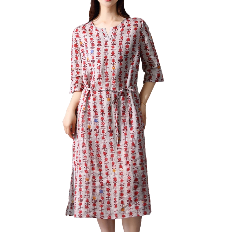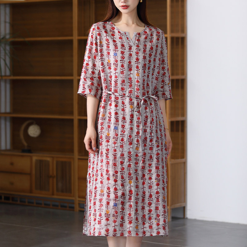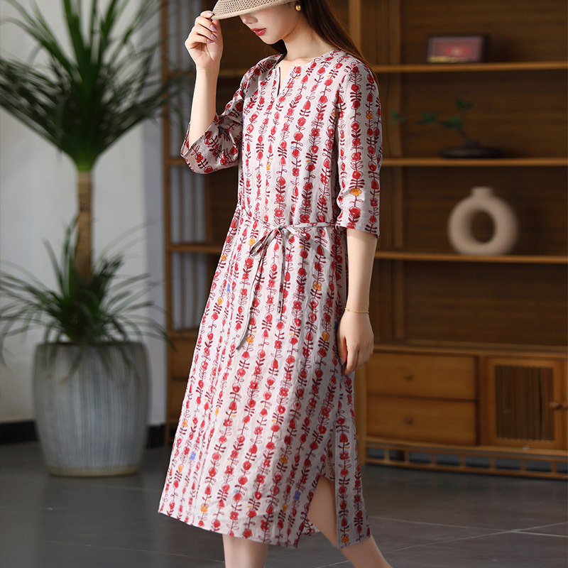 2025新款文艺复古亚麻印花中袖连衣裙慵懒春夏中长裙图片色