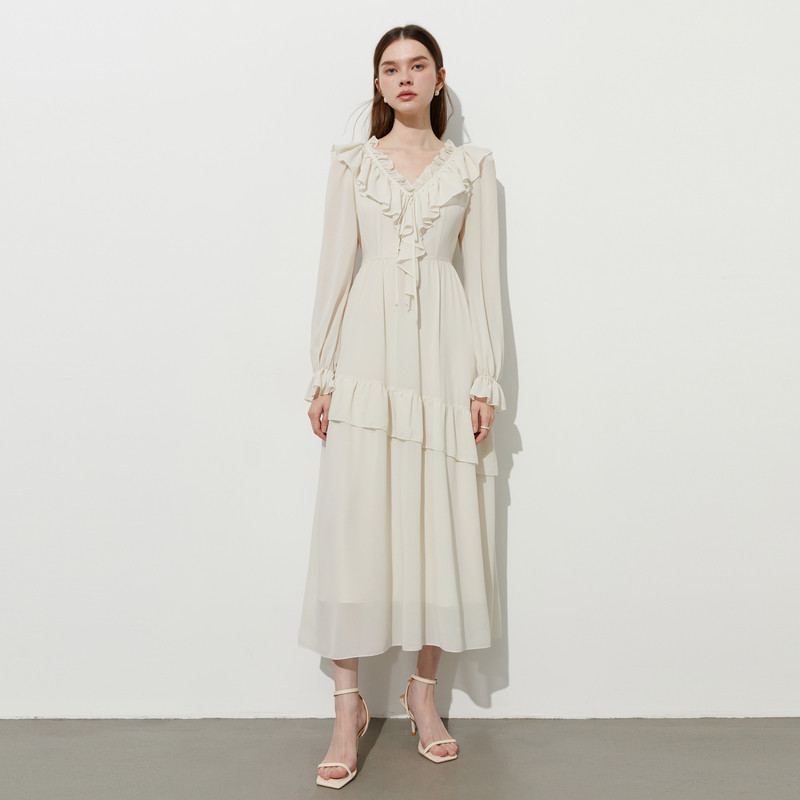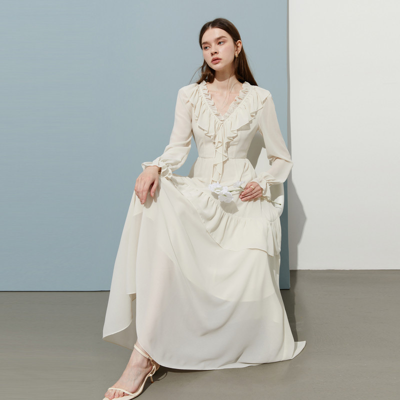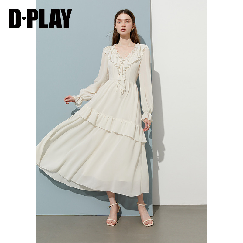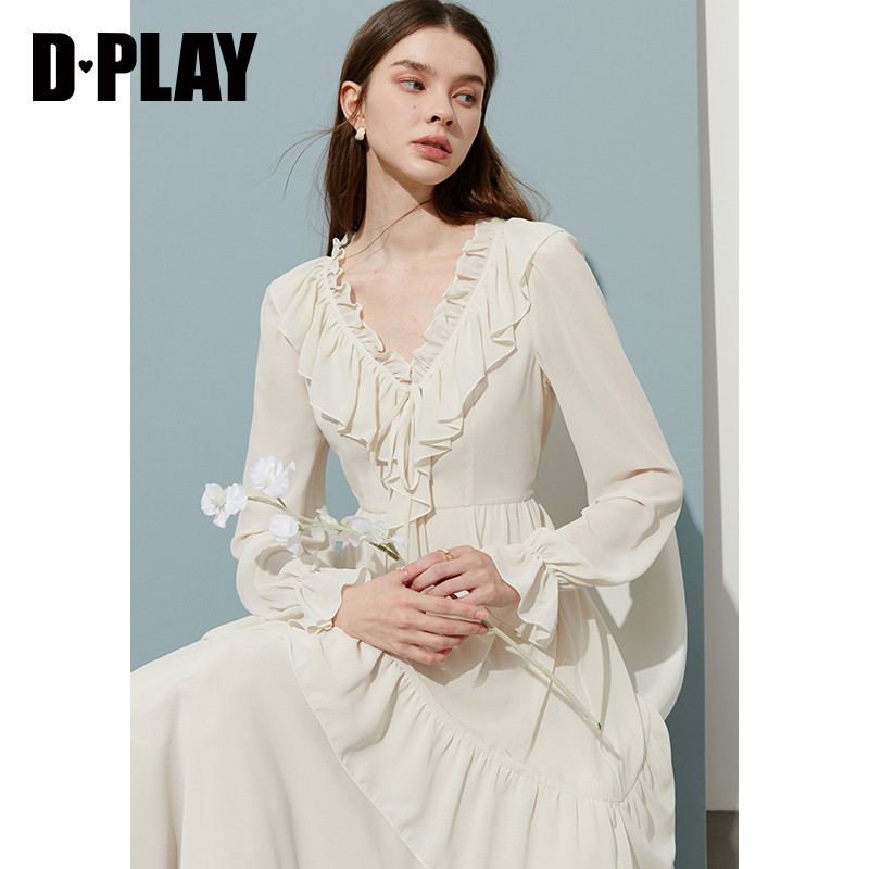 DPLAY【初恋裙系列】2025年秋季新款白色连衣裙女雪纺礼服长裙