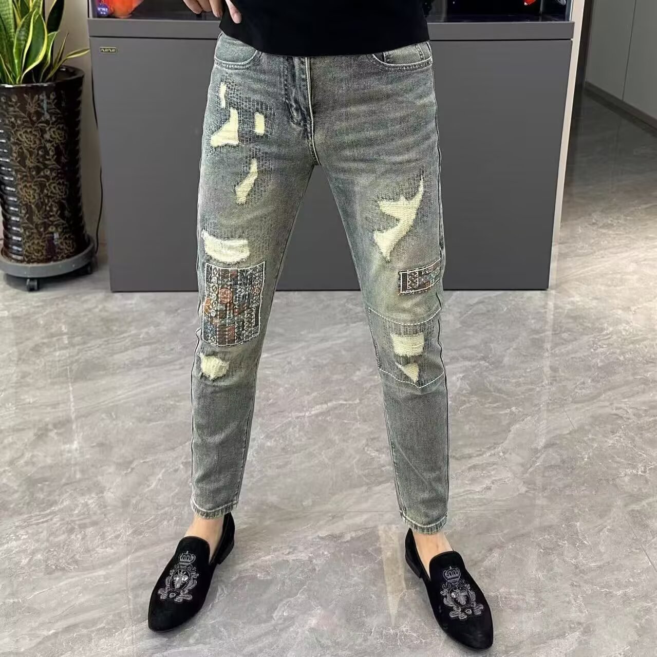 复古水洗牛仔裤男款春季时尚修身休闲百搭破洞补丁潮流小脚裤男士