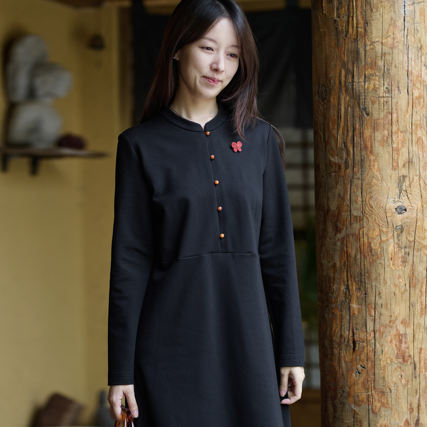 25QDC-111【庄生晓梦】前世今生复古文艺立领修身黑色针织连衣裙