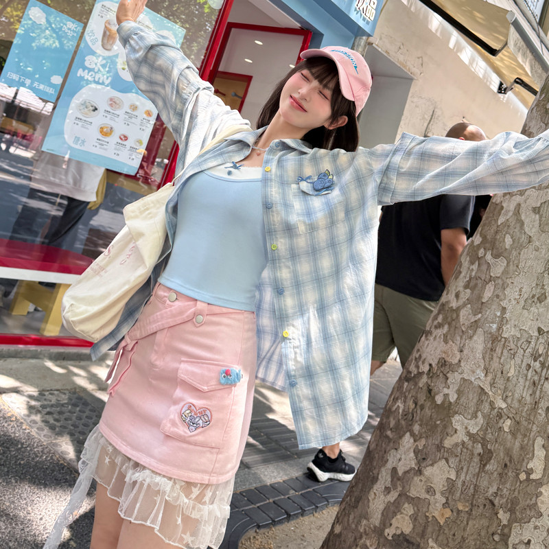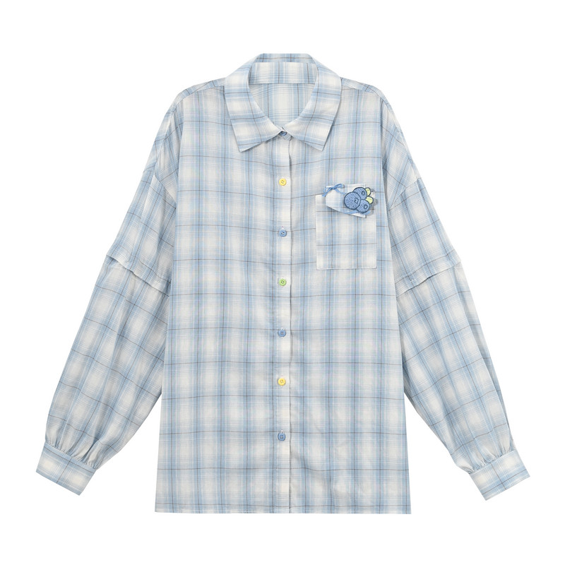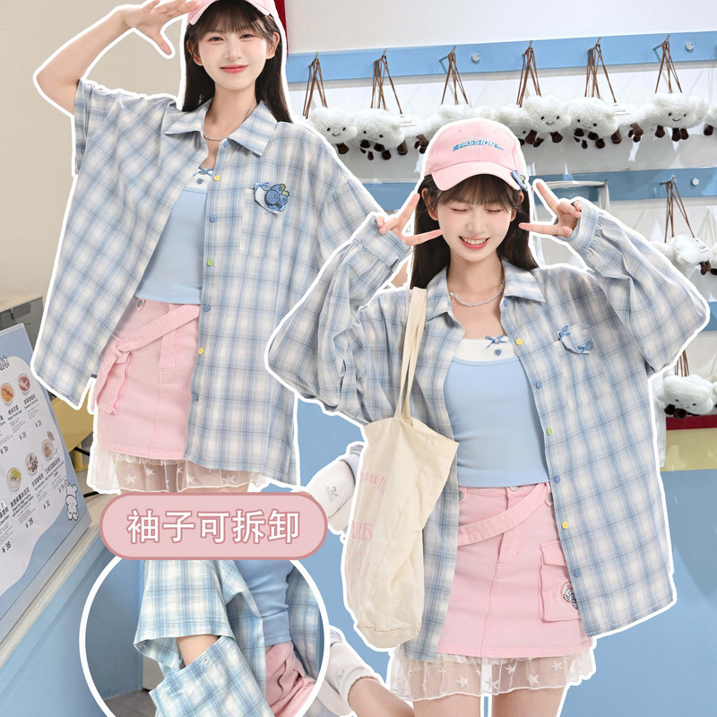 森女部落休闲风通勤两穿上衣减龄蓝色格子宽松衬衫女夏季新款外套