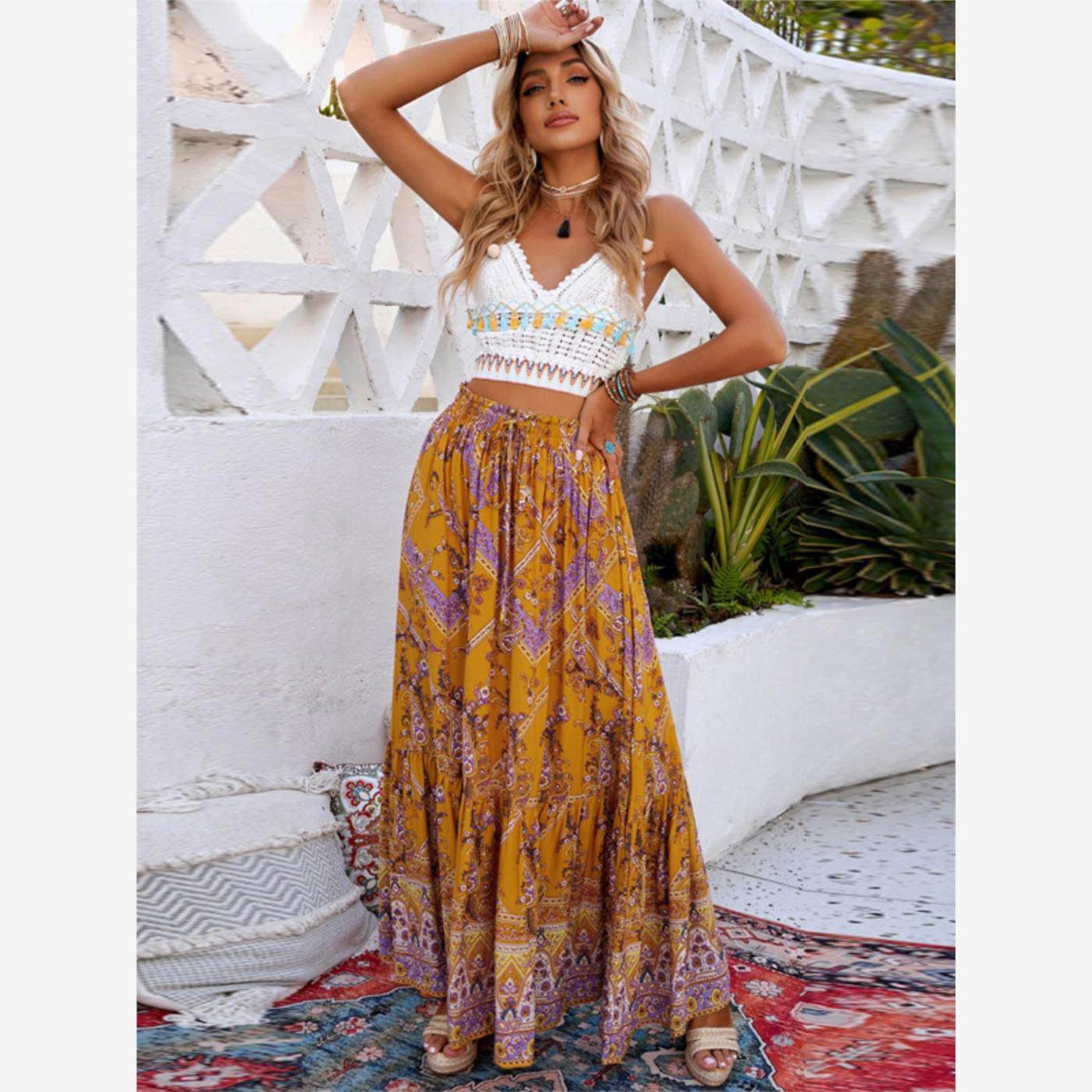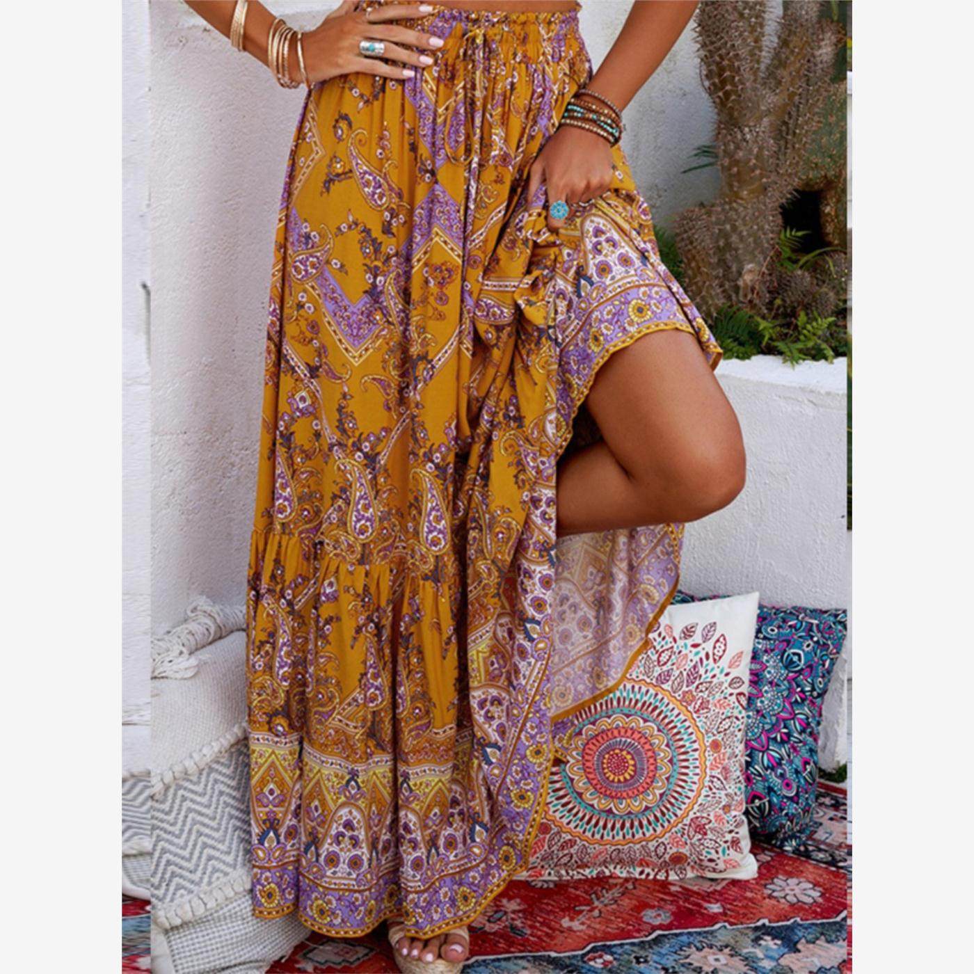 欧美波西米亚度假云南民族风印花夏季大码女装沙滩长裙高腰半身裙