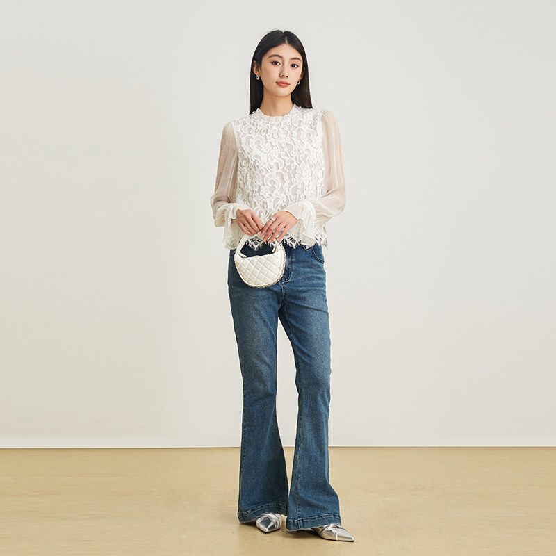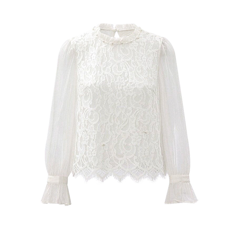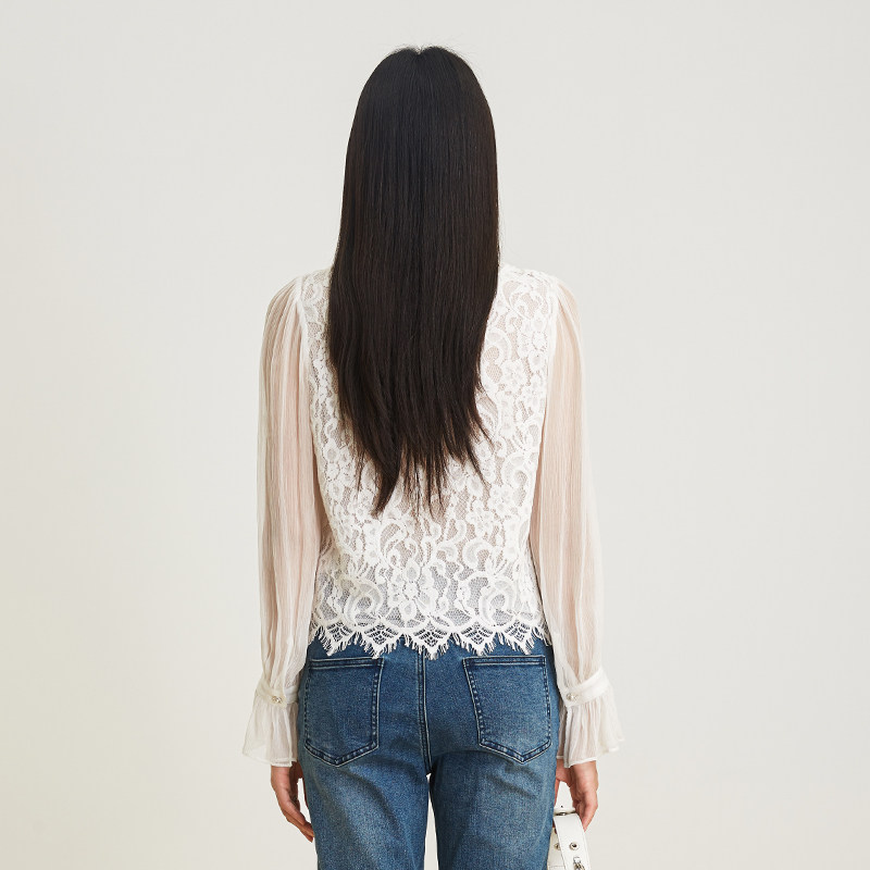 SOMSOM/索玛春季新品复古喇叭袖雪纺衫女法式浪漫蕾丝拼接上衣