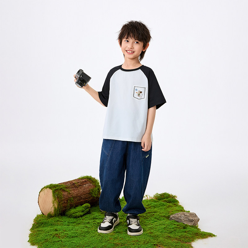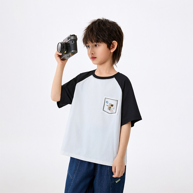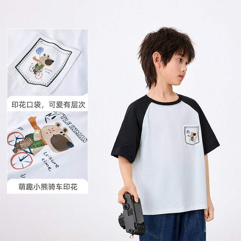 茵曼男童速干短袖t恤小熊汽车印花2025夏季中大童撞色插肩袖上衣