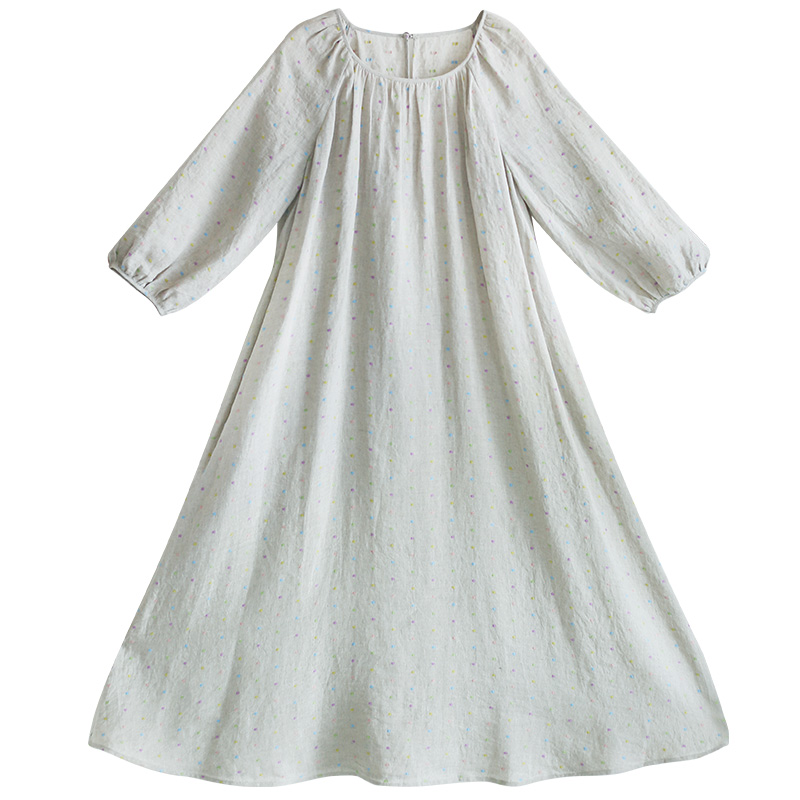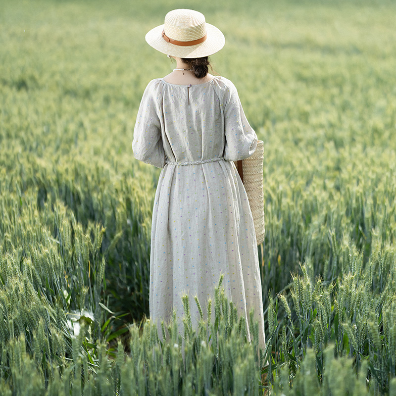 清【山野间】文艺圆领系带亚麻连衣裙女夏季款宽松彩色波点中长裙