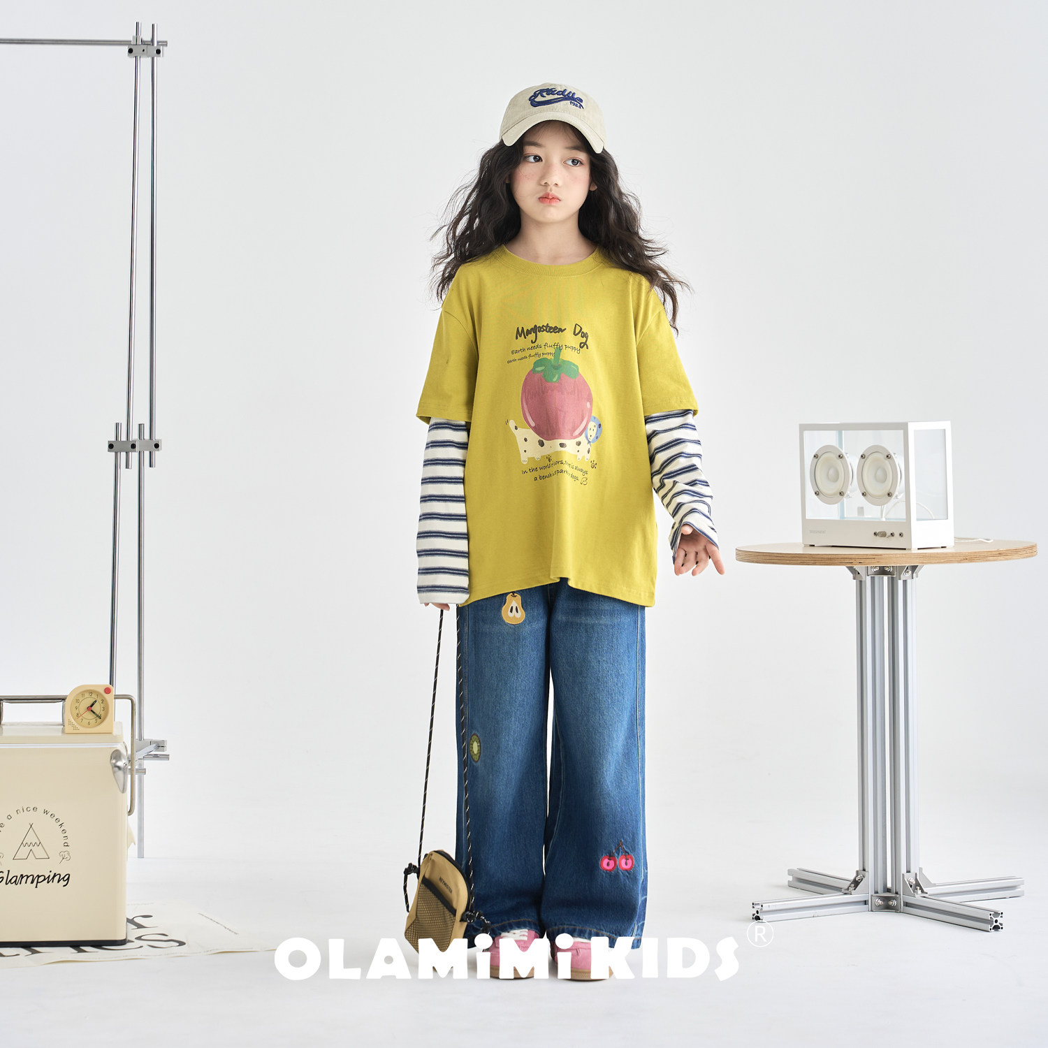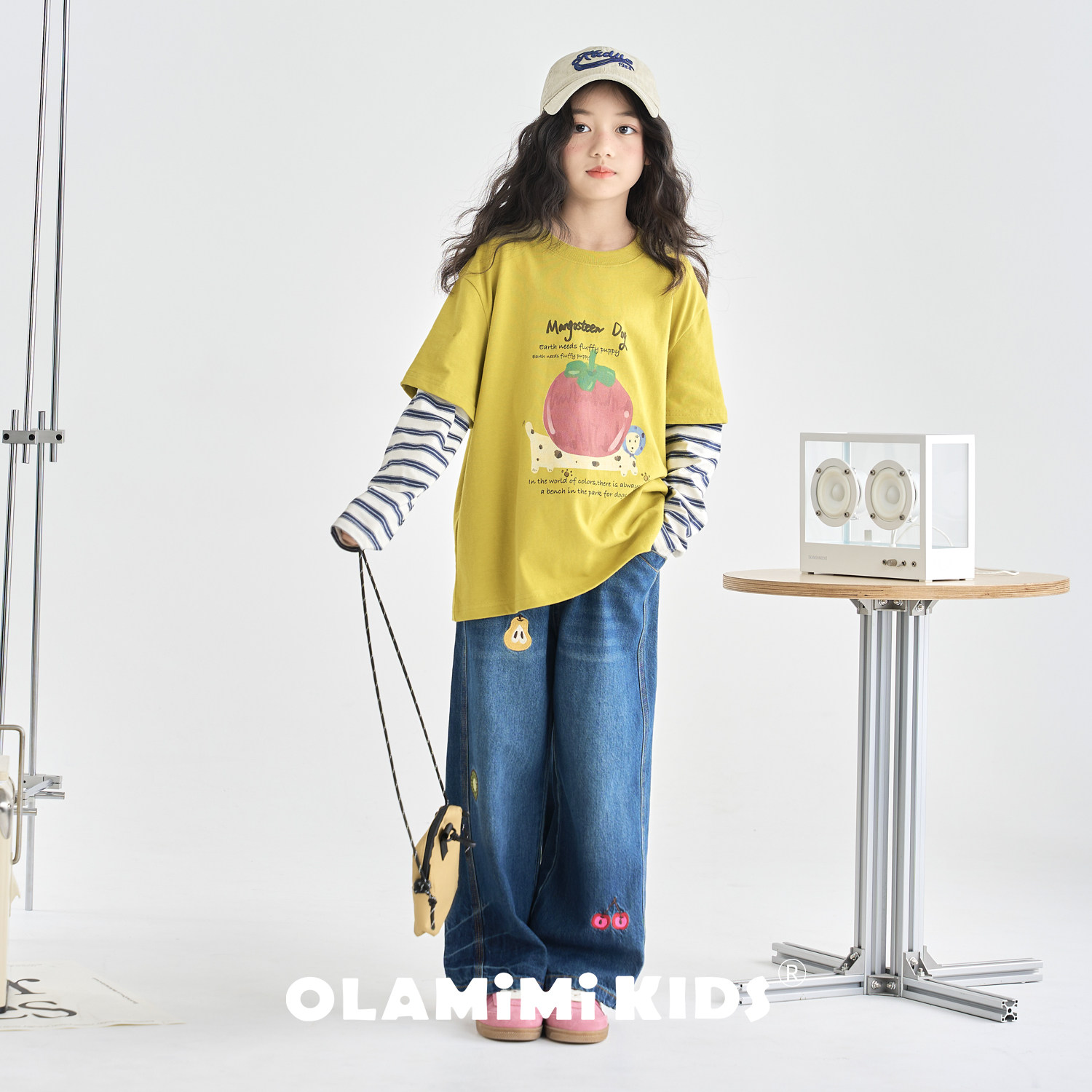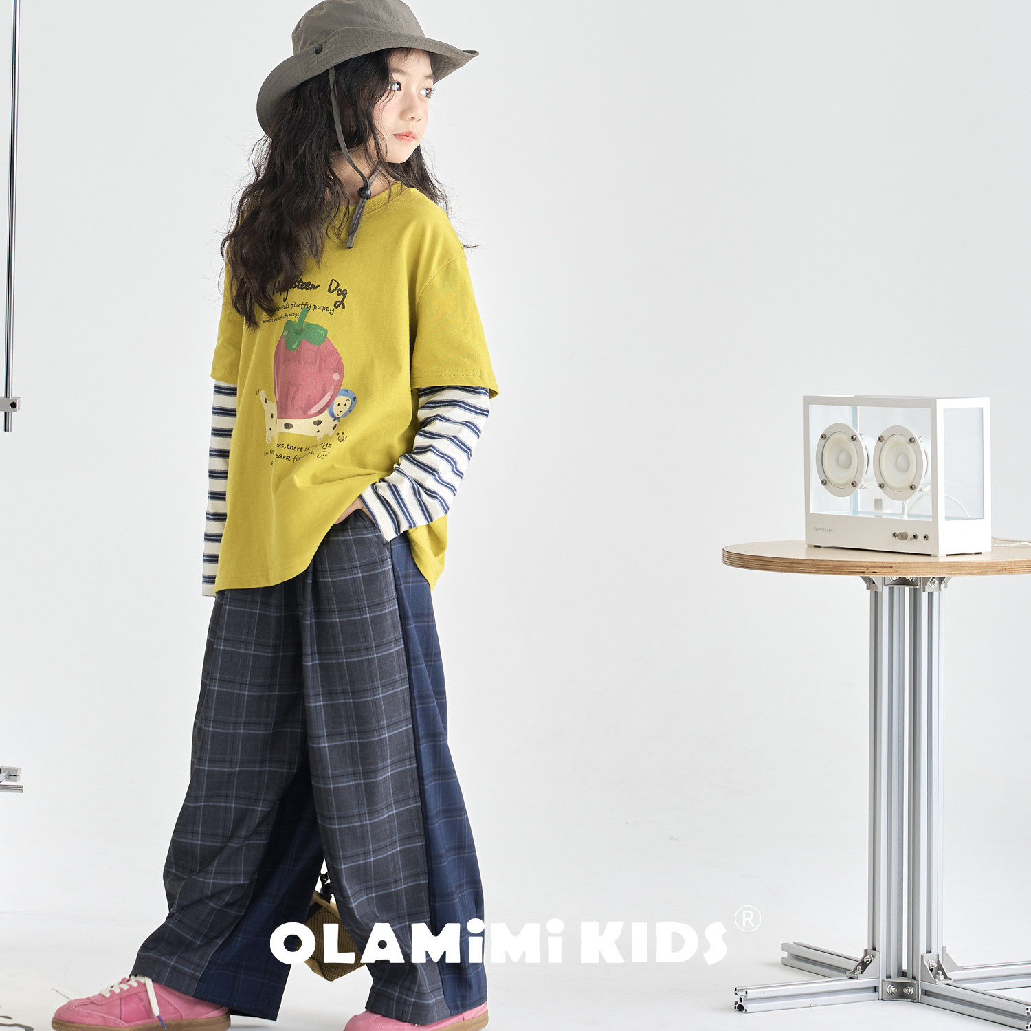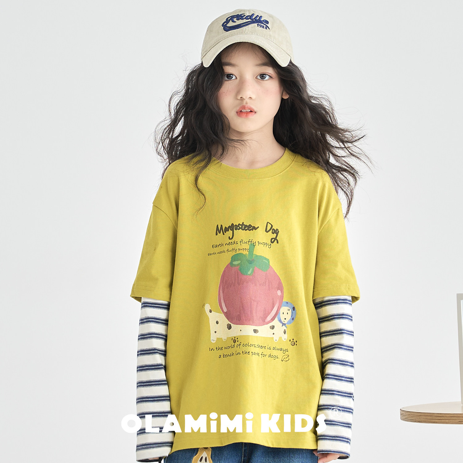 OLAMIMI儿童亲子2026春山竹小狗印花假两件拼条纹纯棉长袖T恤卫衣