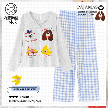 2025新款莫代尔睡衣女春秋季长袖一体自带胸垫卡通格子家居服套装