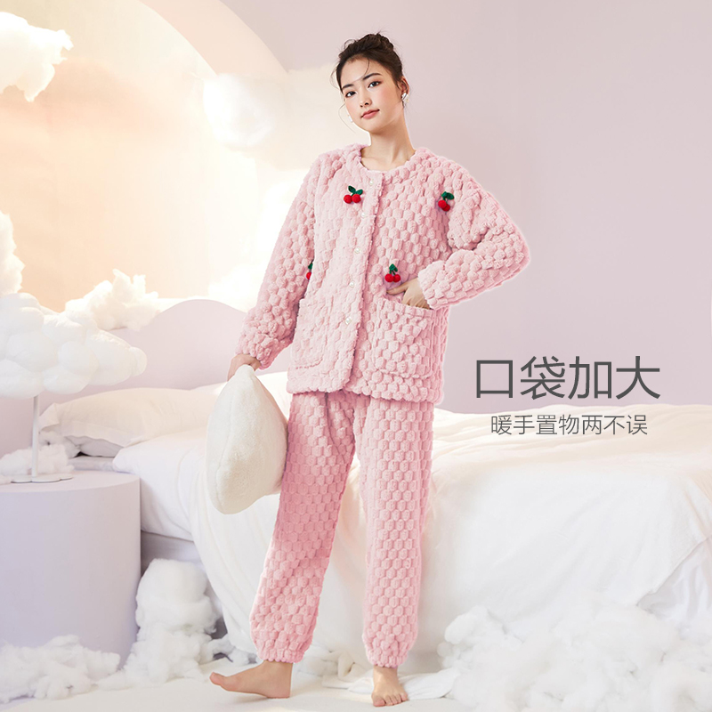 造福鸟珊瑚绒睡衣女秋冬加绒加厚樱桃开衫可外穿家居服套装