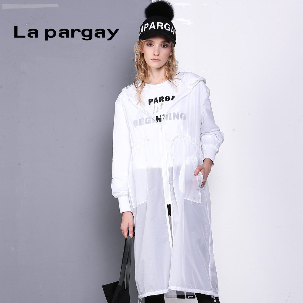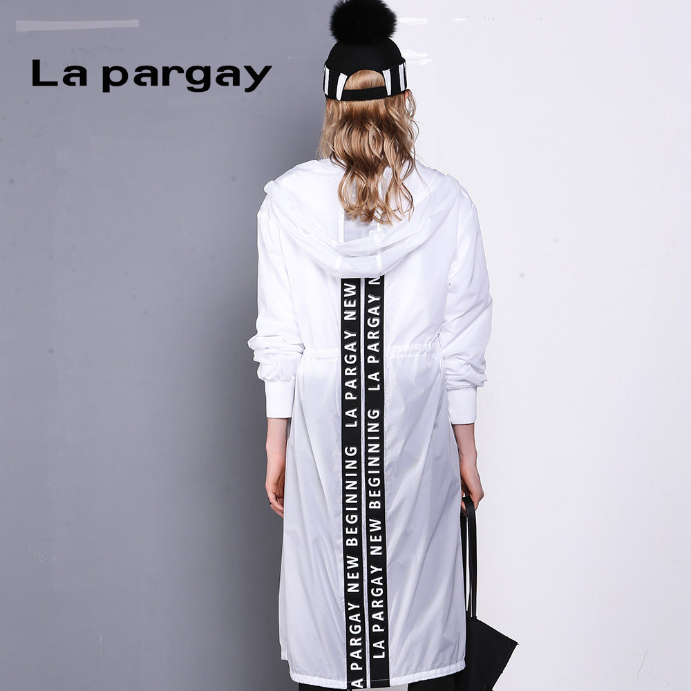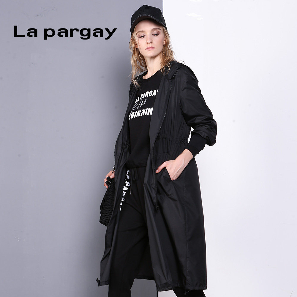 Lapargay纳帕佳新款女装秋季黑白色印花抽绳中长款风衣外套