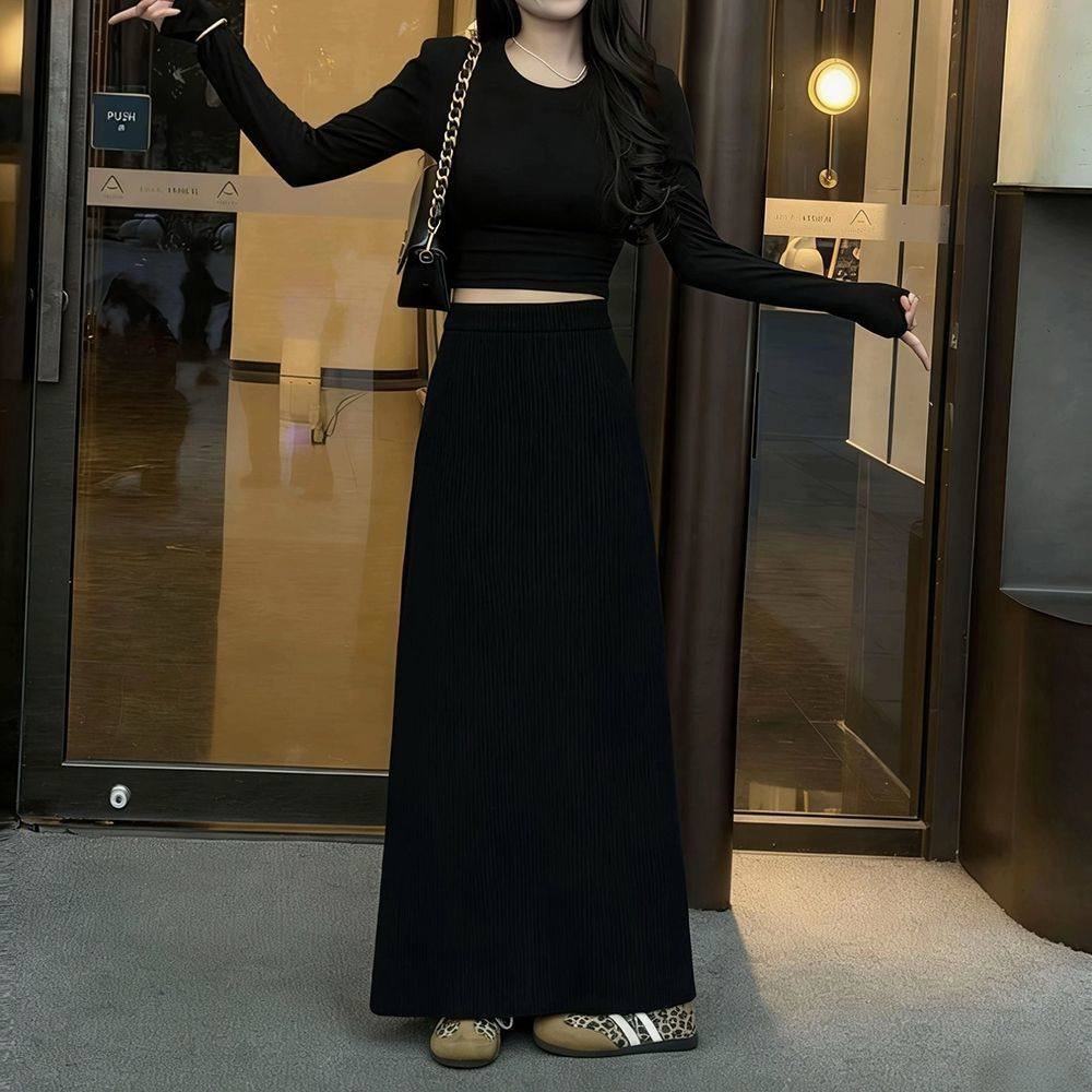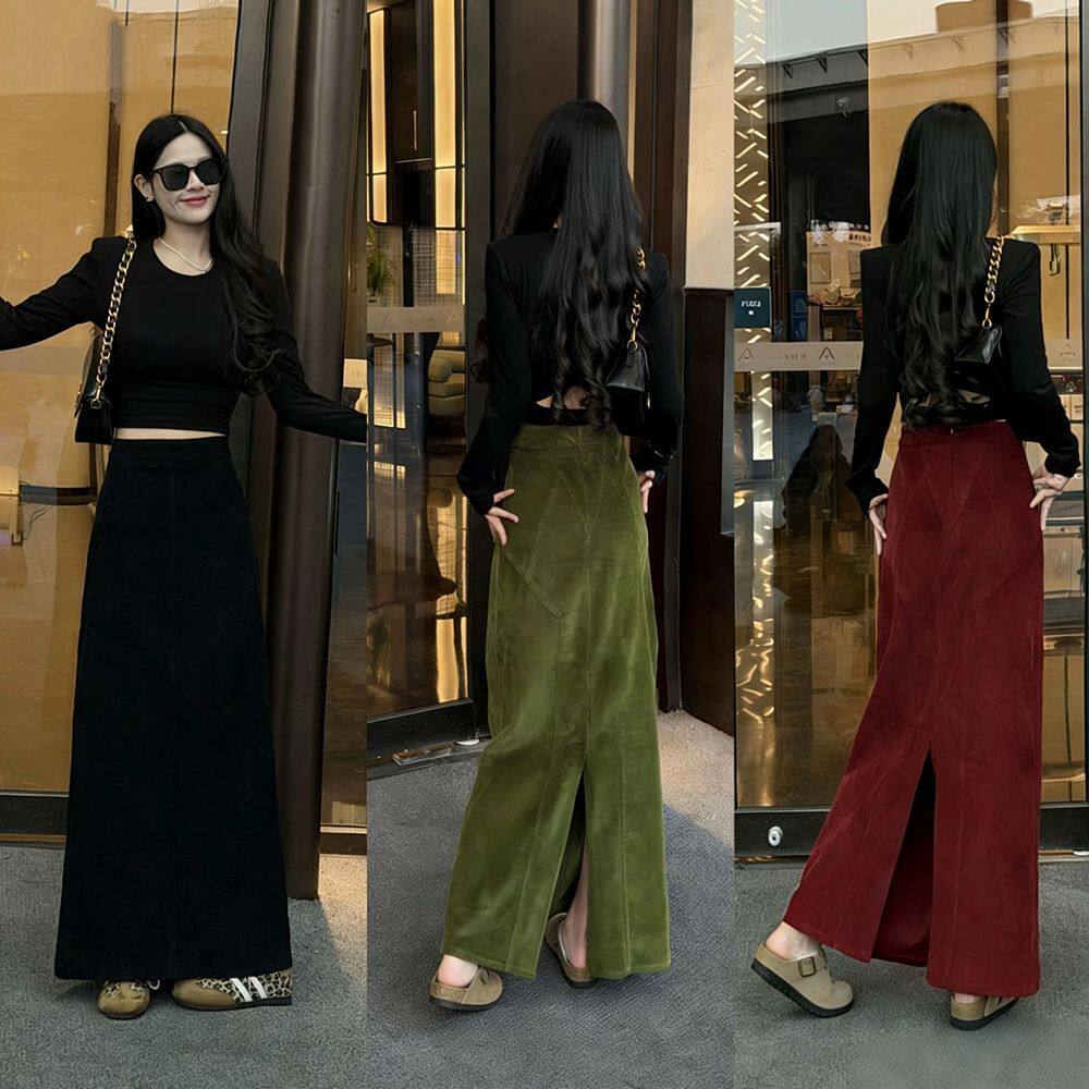 小众温柔复古灯芯绒绿色半身裙长宽高腰显瘦时尚直筒2026冬季女