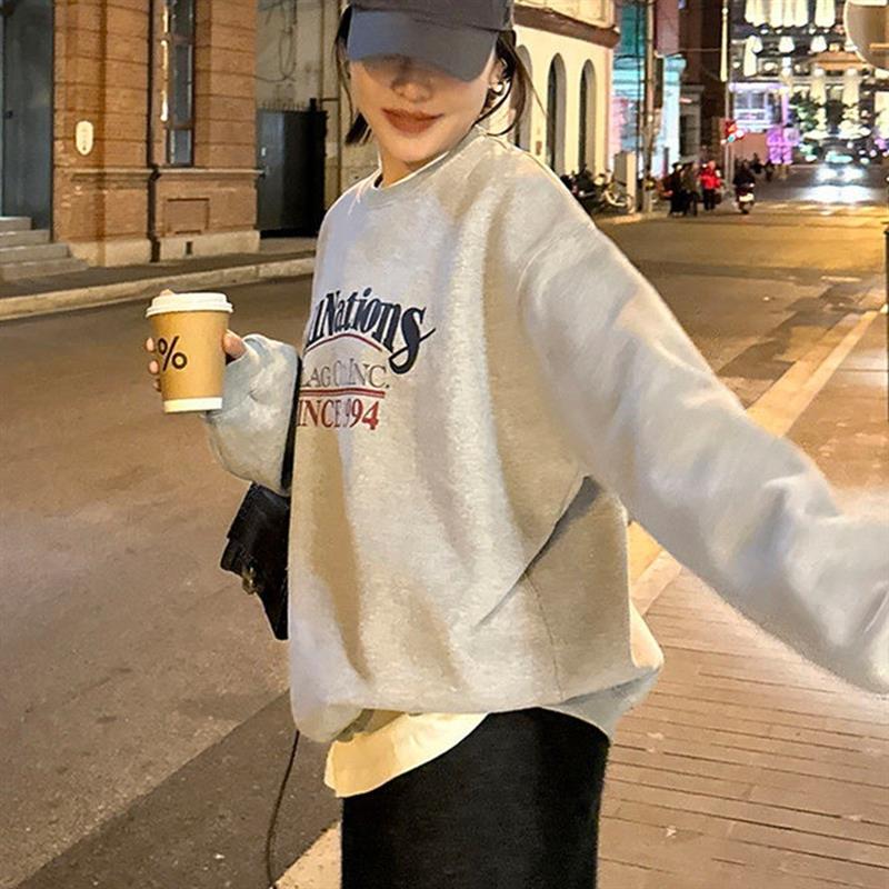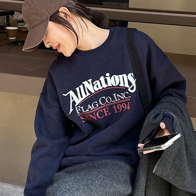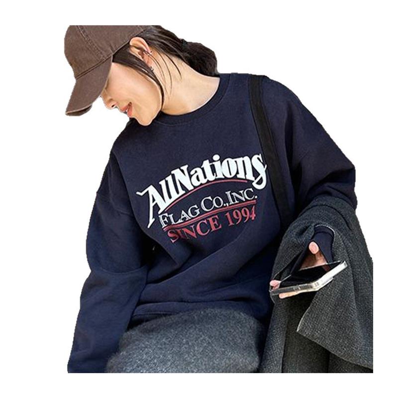 韩版字母印花加绒藏青色卫衣女学生秋冬慵懒风宽松圆领套头女上衣