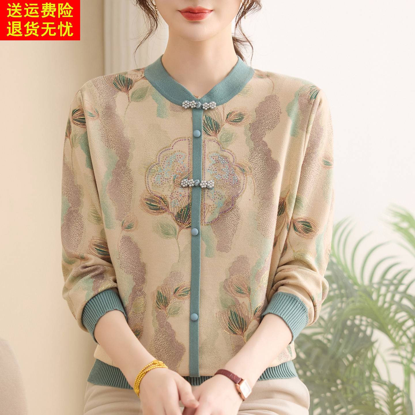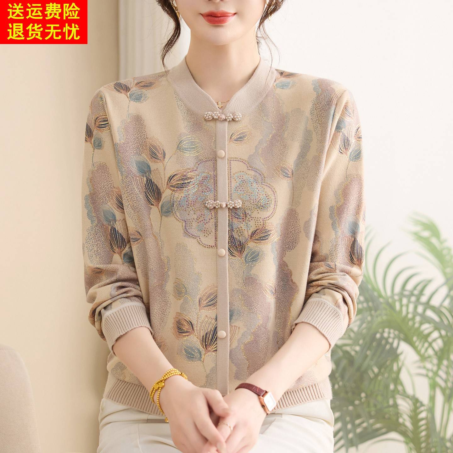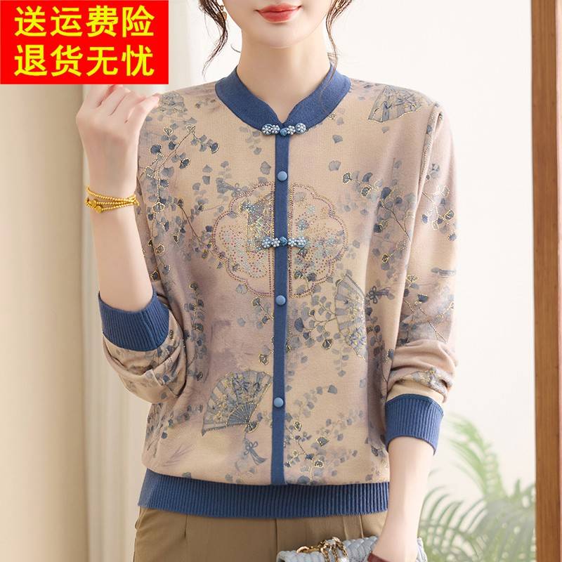 初秋薄针织衫加肥加大码桑蚕丝长袖上衣中老年妈妈新中式打底衫女