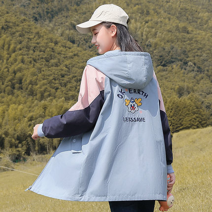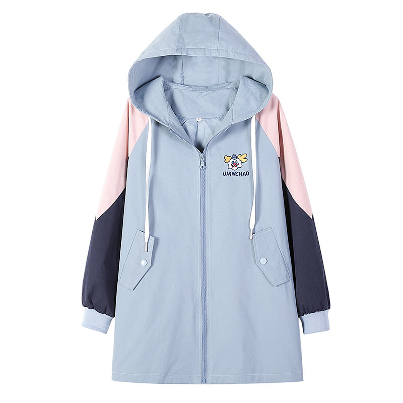 初中生休闲风衣少女休闲秋冬装学院风小丑绣花长袖中长款拼色外套