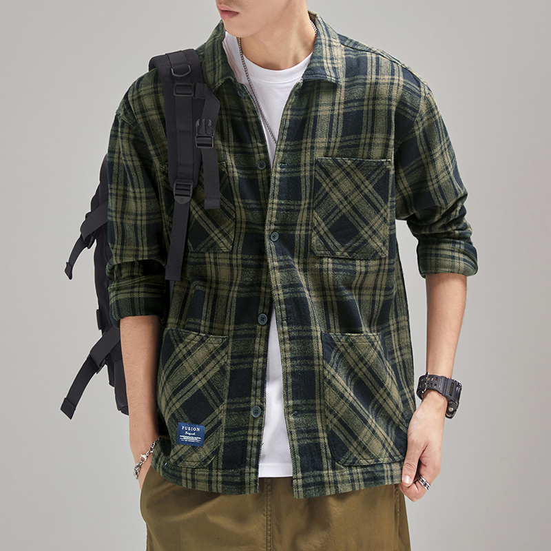 条纹长袖衬衫厚复古格纹外套水洗美式复古磨毛纯棉男士商务韩版装