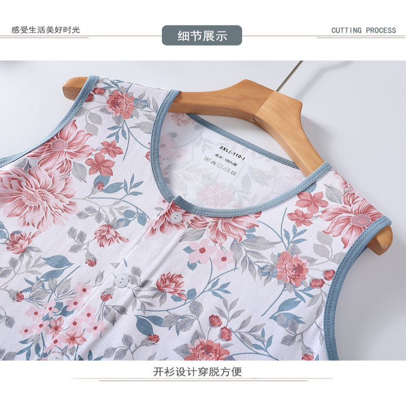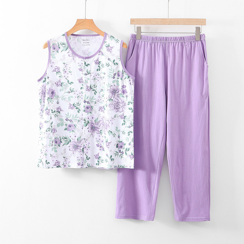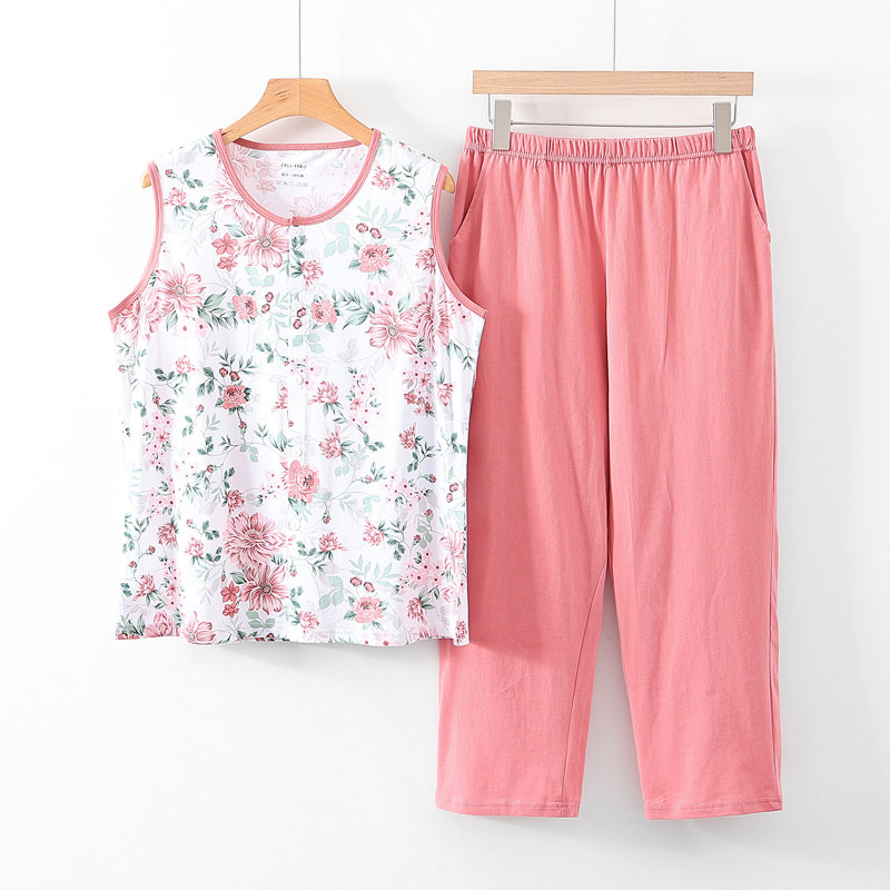 中老年妈妈睡衣夏装女纯棉开衫无袖九分裤家居服套装老太太花背心