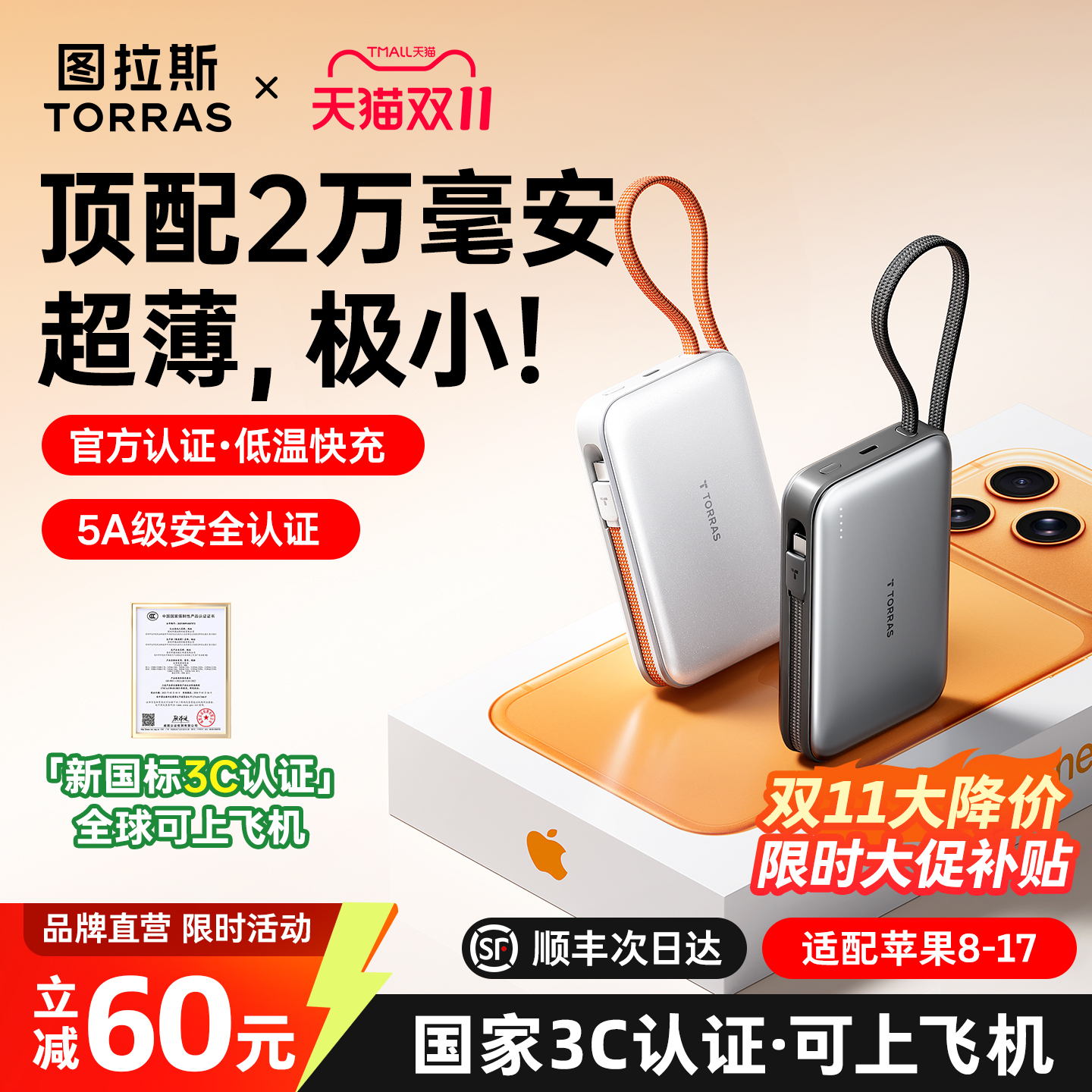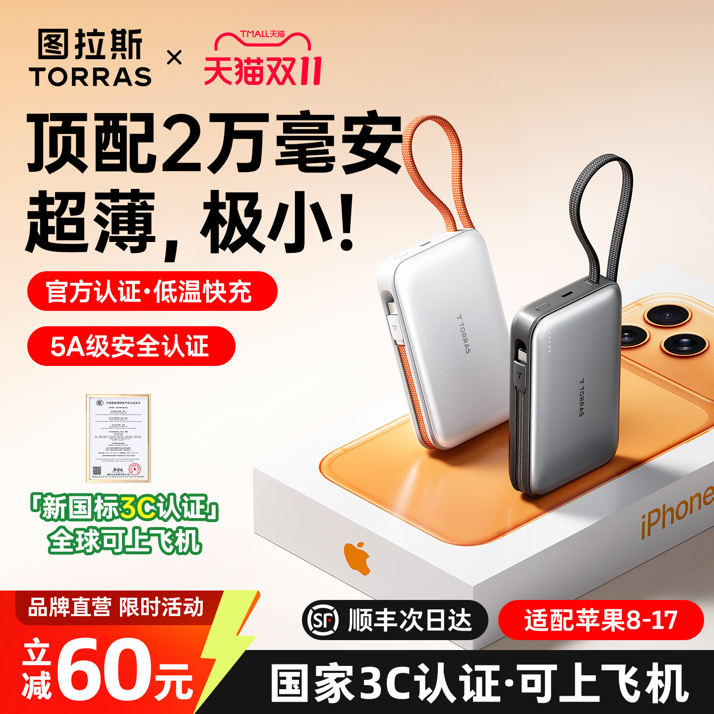图拉斯20000毫安充电宝大容量3C认证可上飞机2025新款自带线适用苹果17快充超薄小巧便携移动电源官方旗舰店