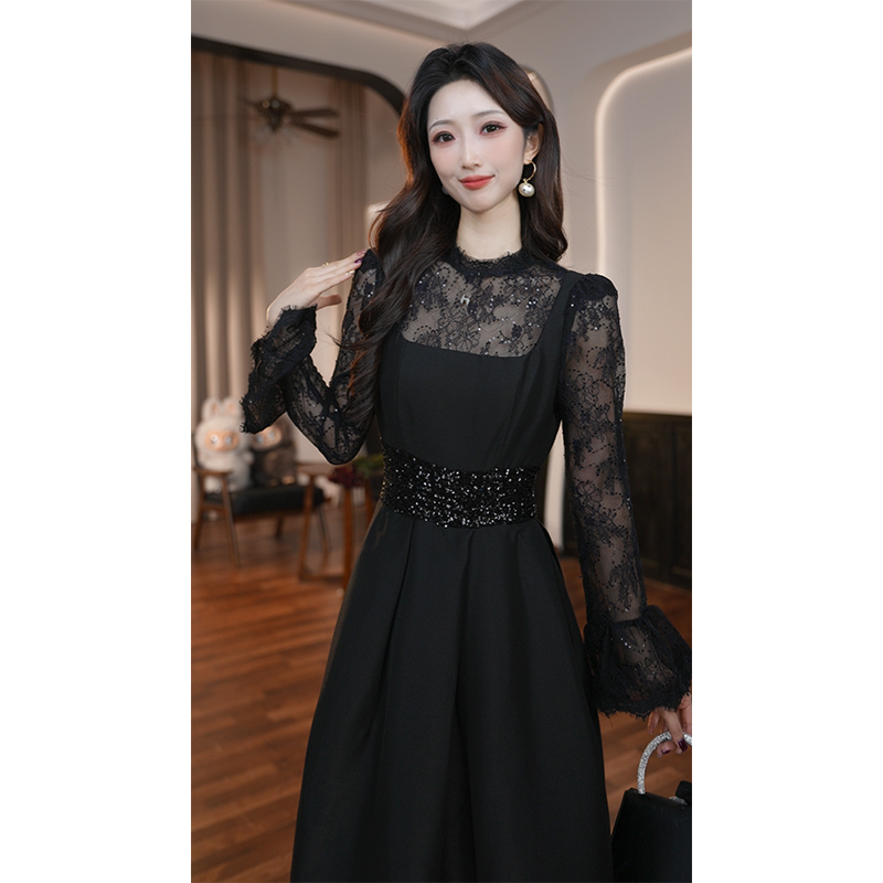 秋季新款女装黑色拼接蕾丝礼服气质长袖连衣裙21610