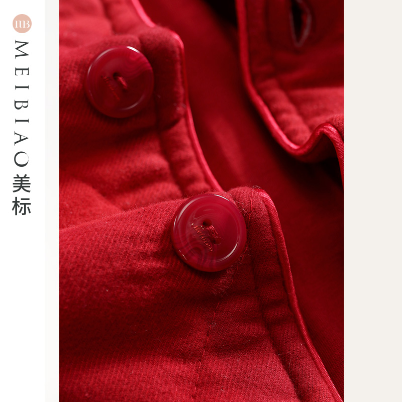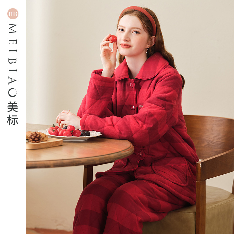 美标三层加厚夹棉情侣纯棉睡衣套装女秋冬本命年红色全棉家居服男
