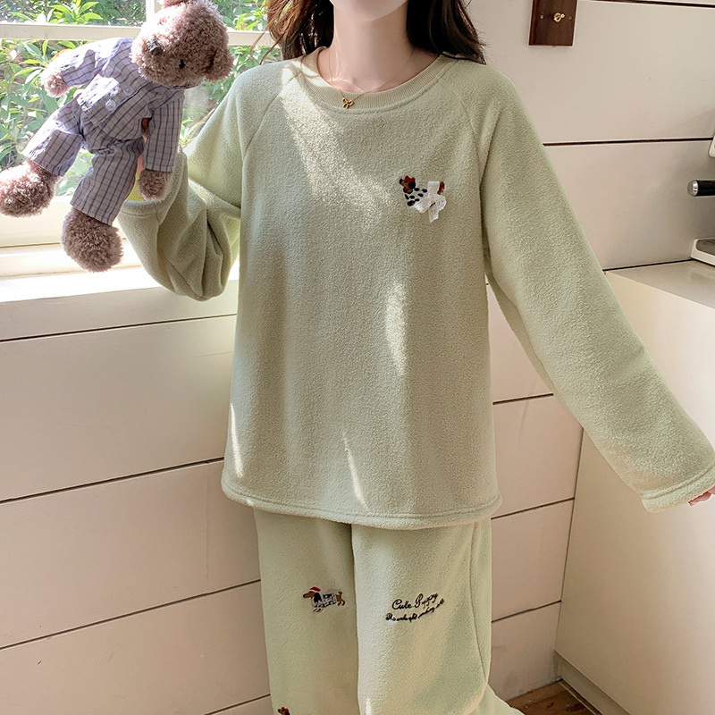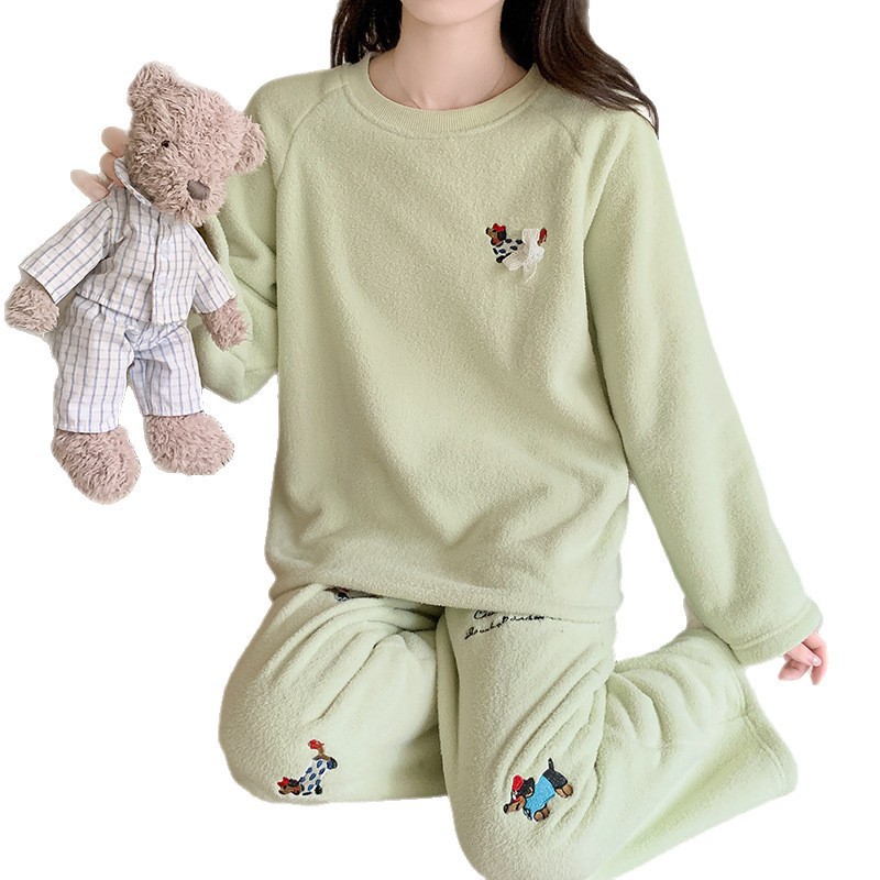 喔密哒睡衣冬季珊瑚绒女士可爱刺绣果粒绒家居服加厚保暖长袖套装