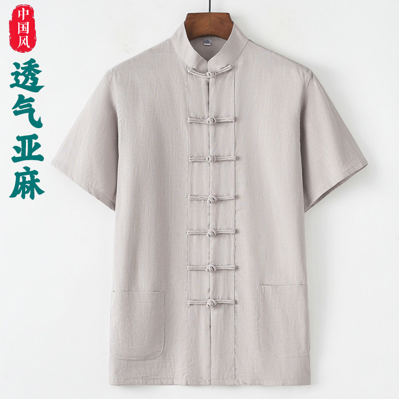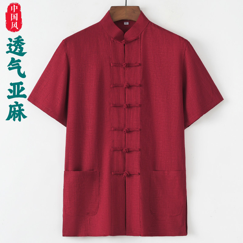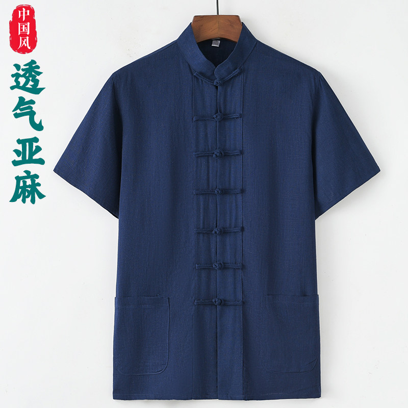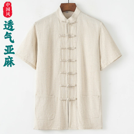 唐装男中老年夏季薄款亚麻短袖中国风中式复古盘扣衬衫爷爷爸爸装