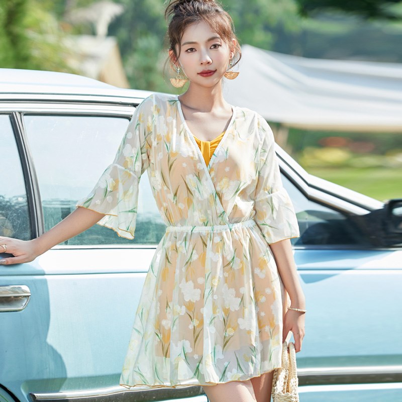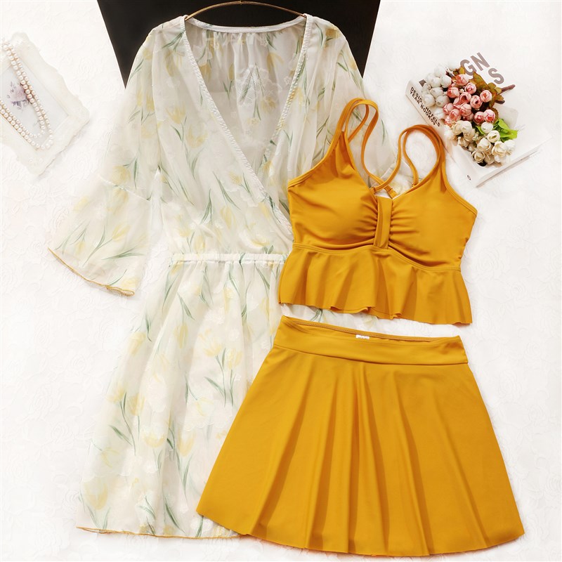 【暖意姜黄】女士分体泳衣三件套显白显瘦高腰裙裤新款泡温泉泳装