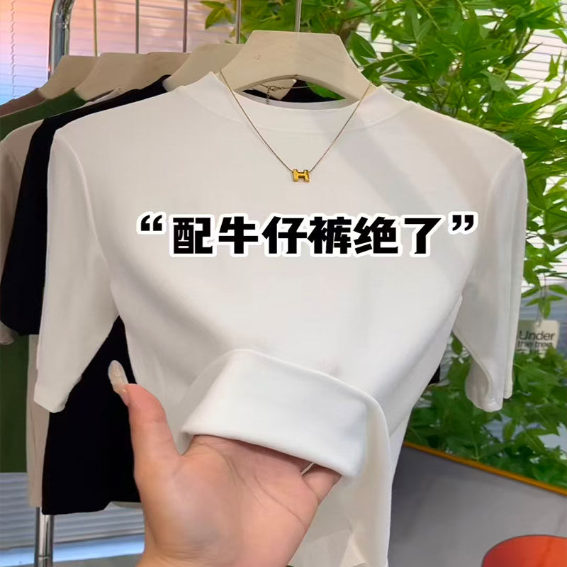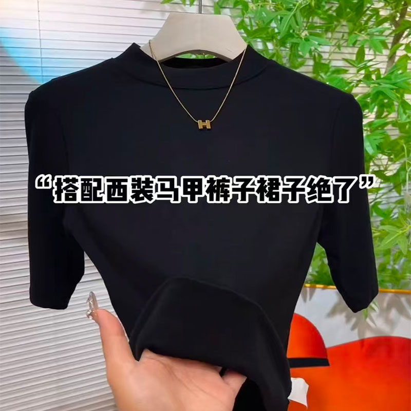 早秋龙奎紫色中领五分袖纯色弹力T恤女修身显瘦百搭小众中袖上衣