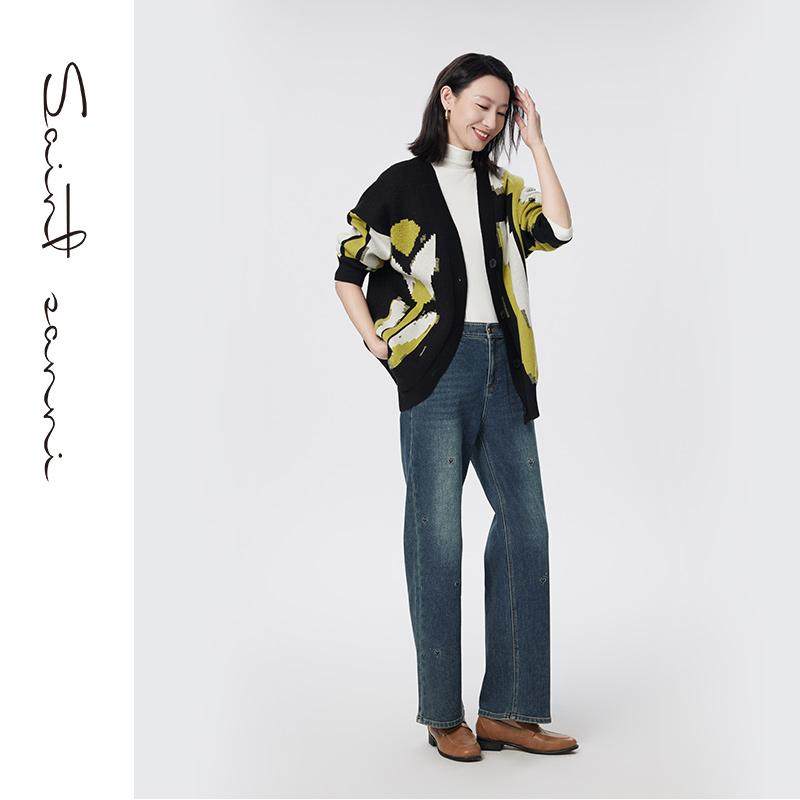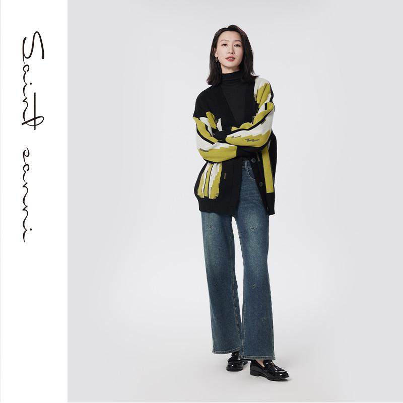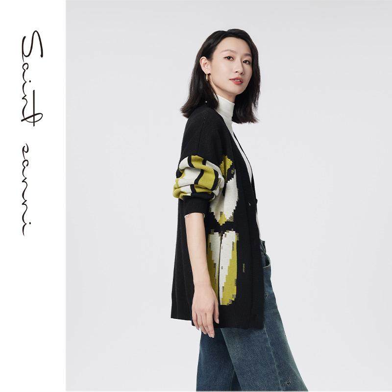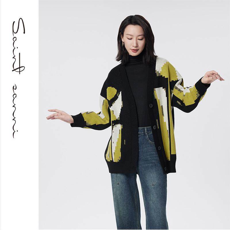 圣轩尼新款设计师商场同款撞色V领中长宽松开衫针织衫外套GF235