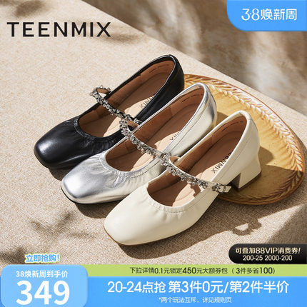 天美意软底复古银色玛丽珍皮鞋女鞋子高跟鞋浅口单鞋春季新款