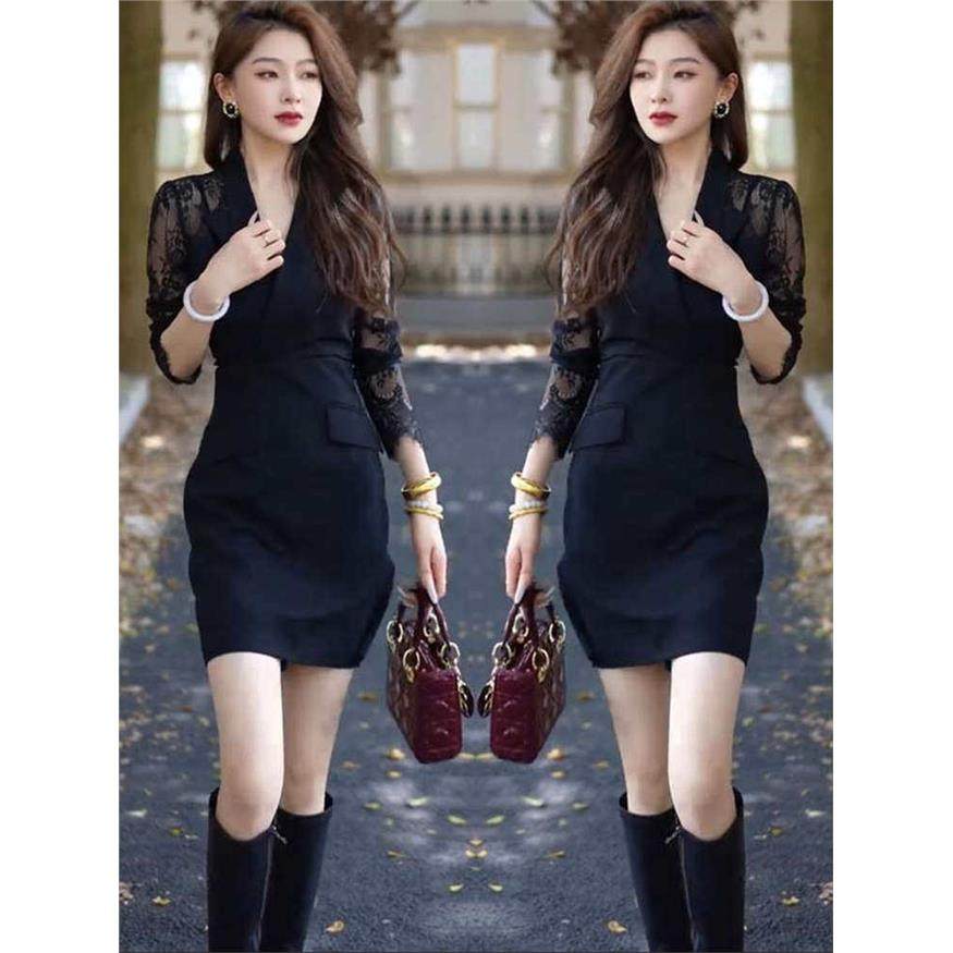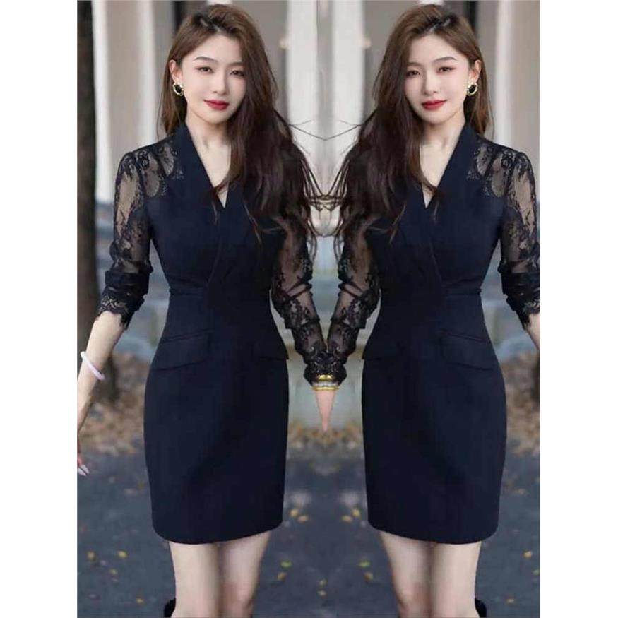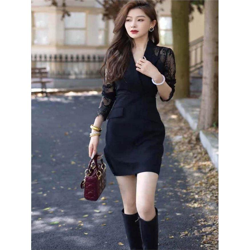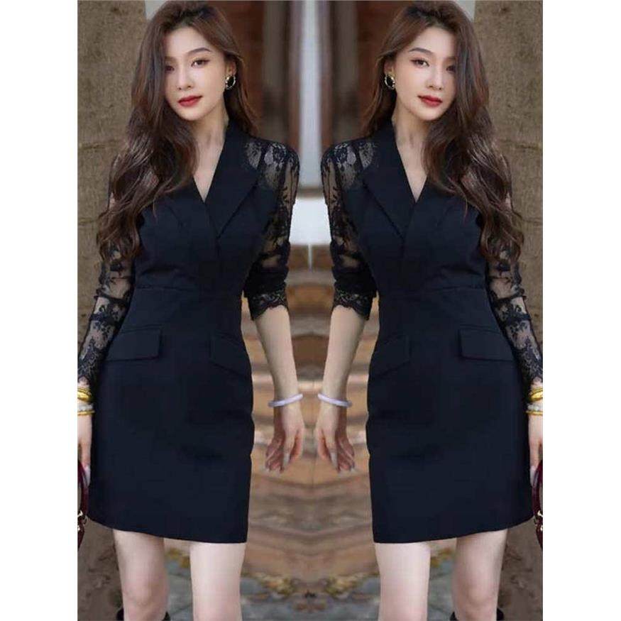 2026早春新款气质高级感西装领拼接蕾丝袖御姐风修身显瘦连衣裙女