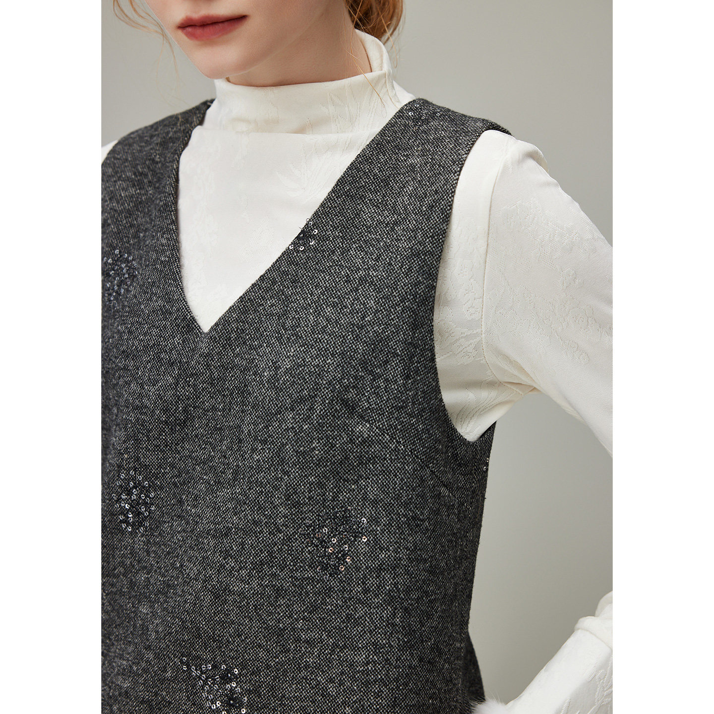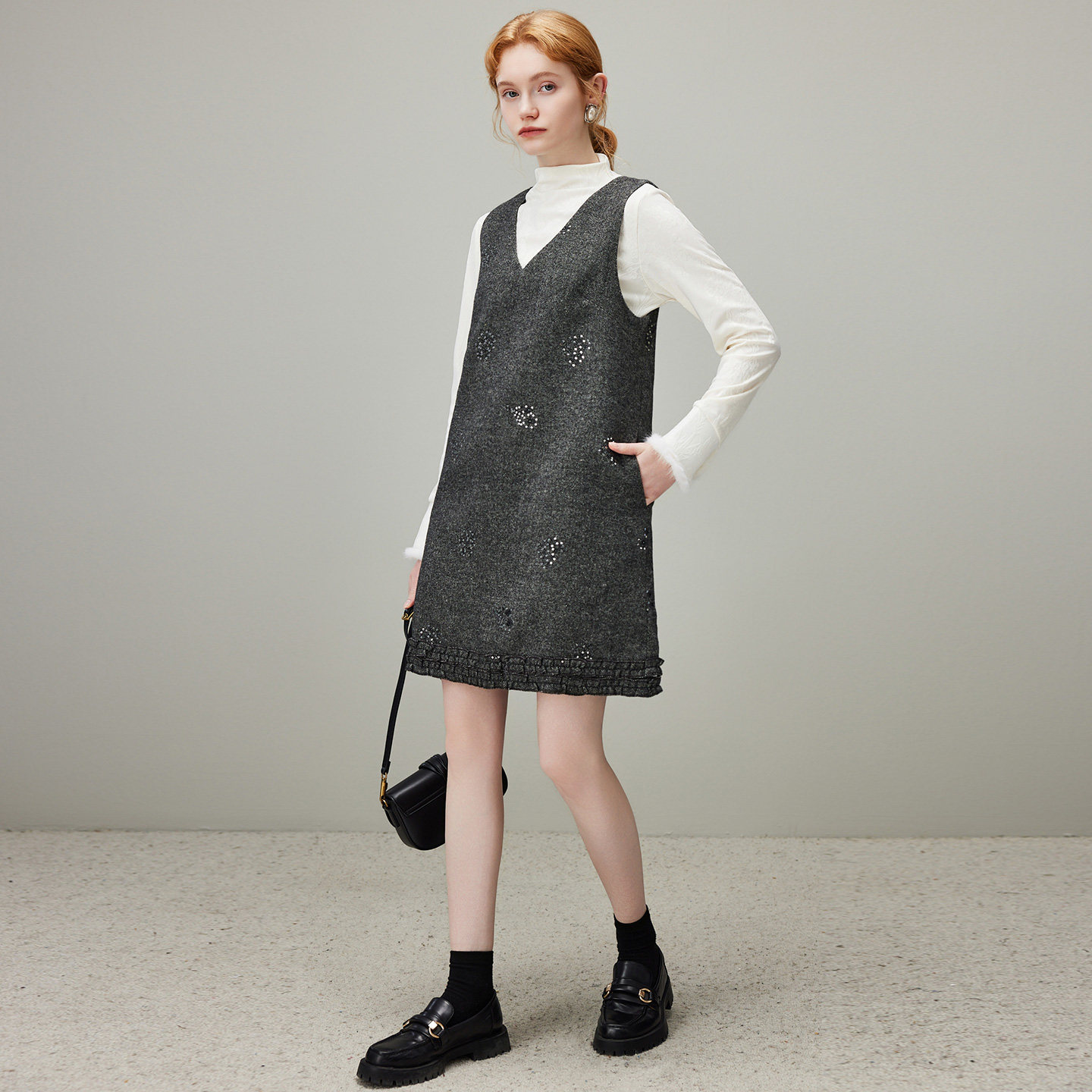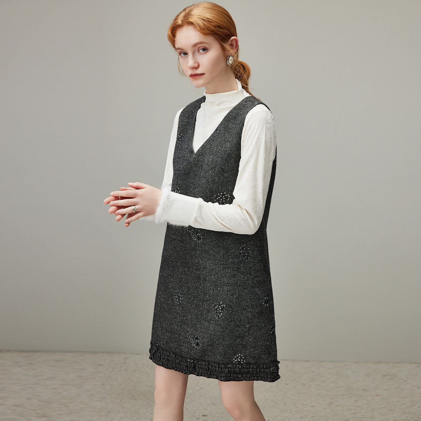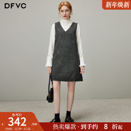 dfvc灰色法式V领羊毛背心裙