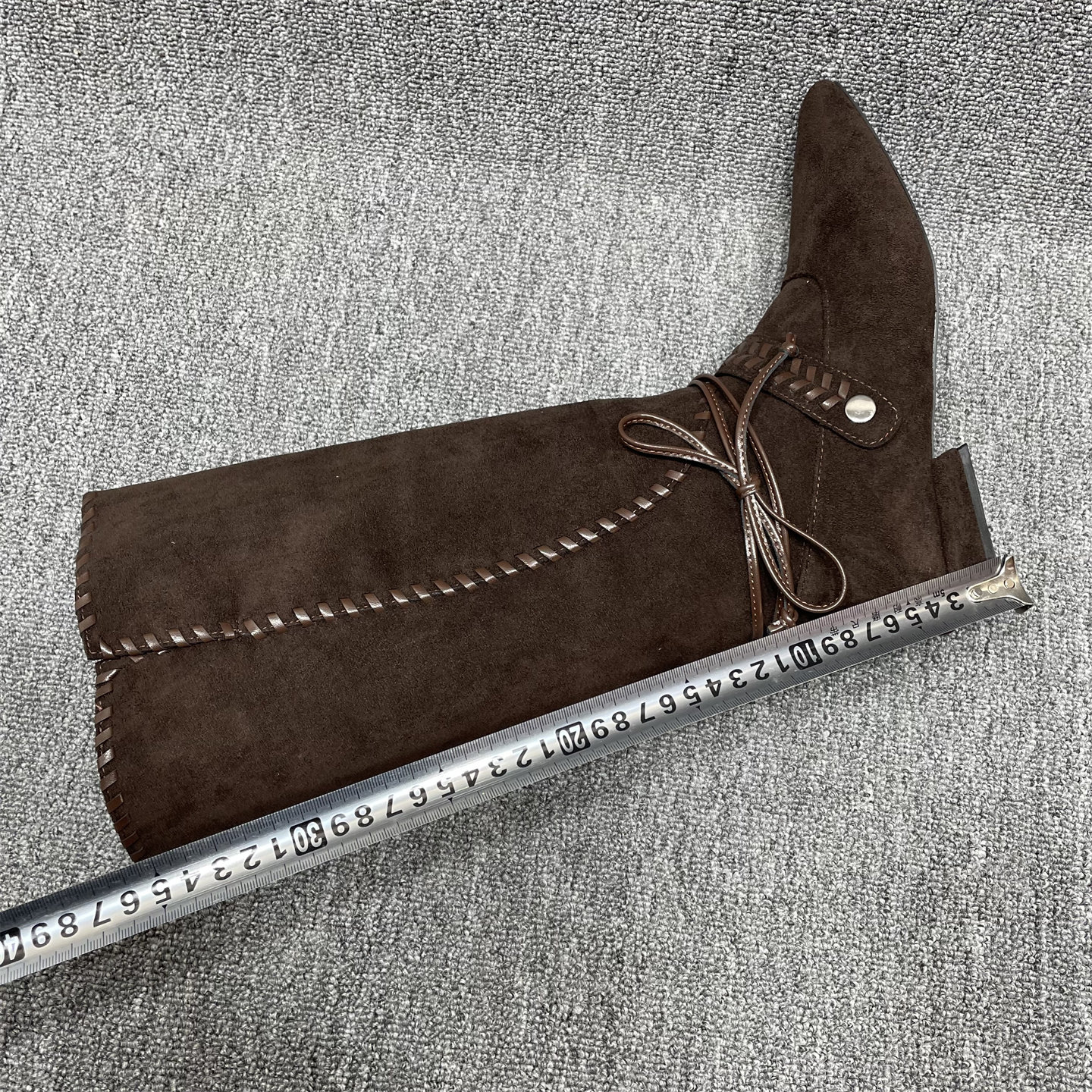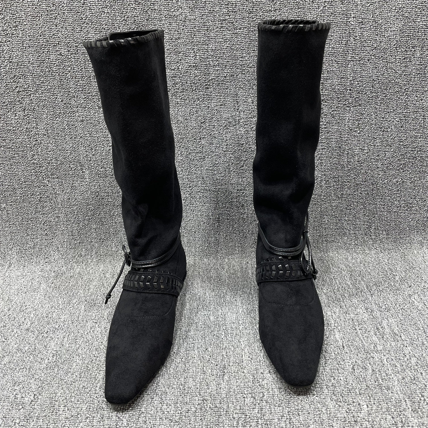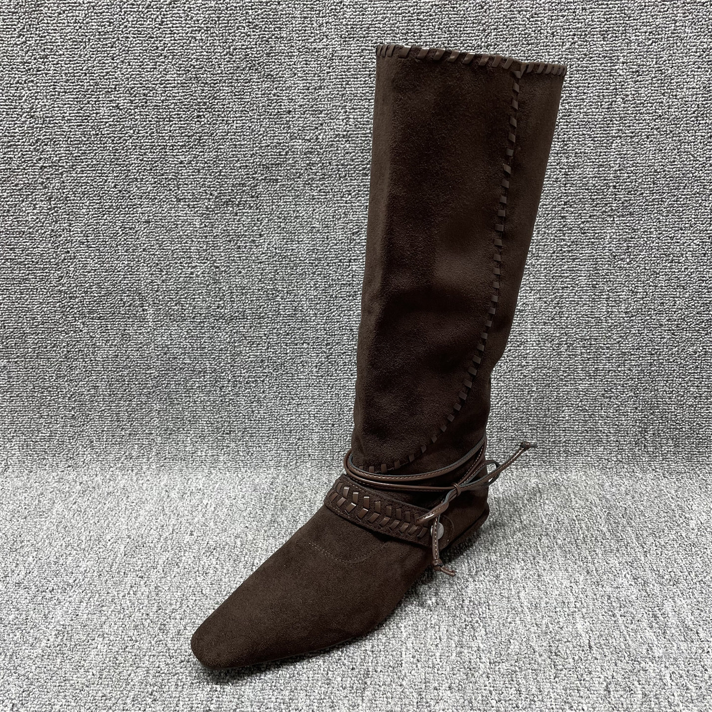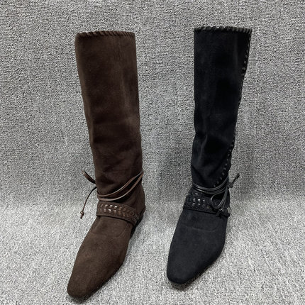 断码处理绒面方头高筒靴女秋冬新款绑带编织不过膝长靴显瘦骑士靴