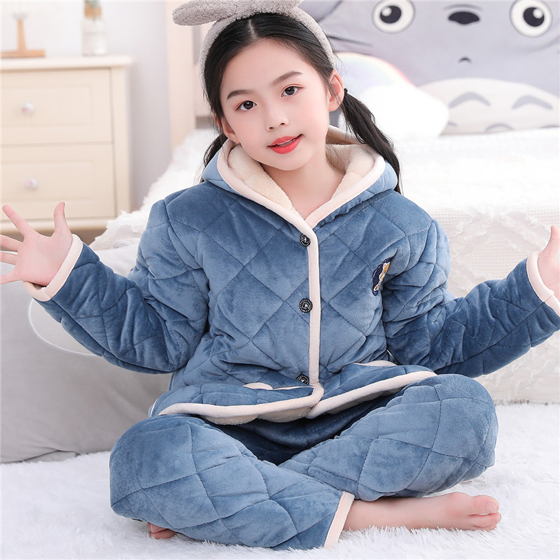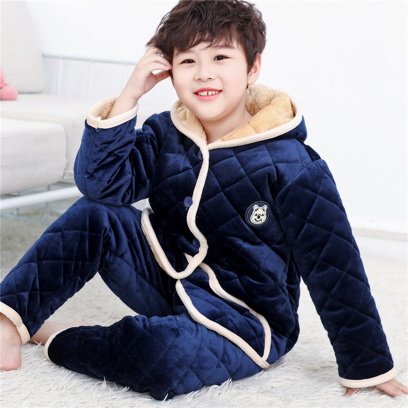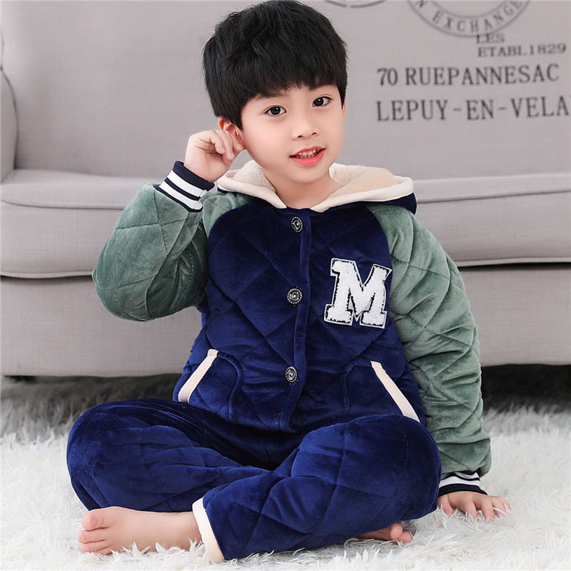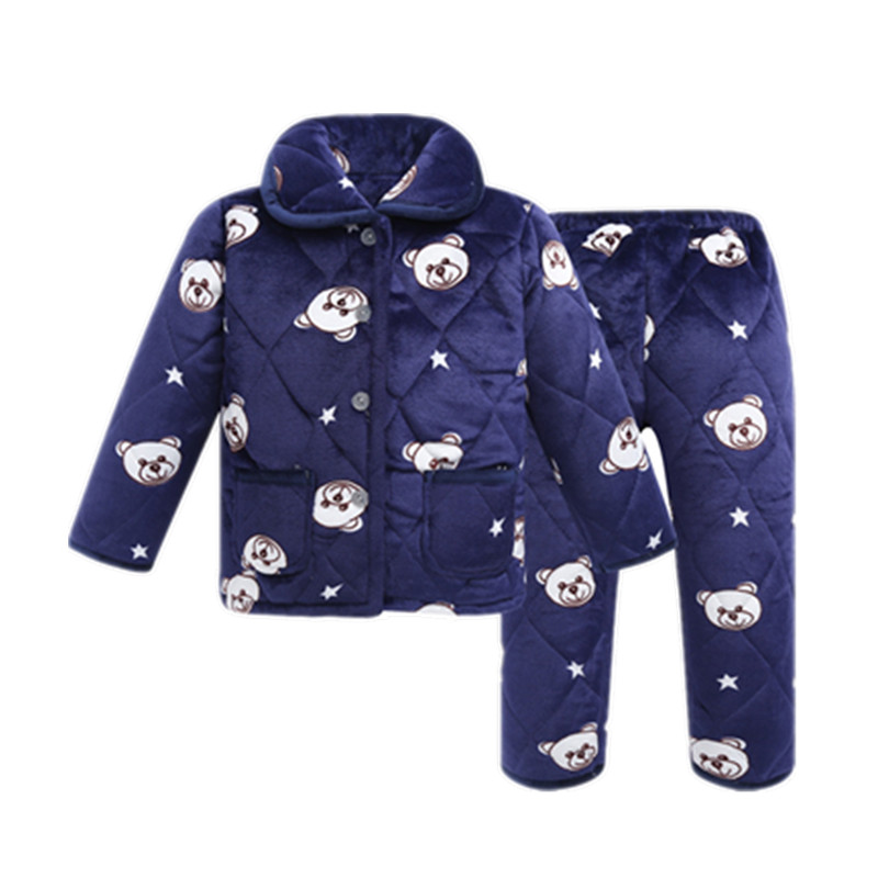 儿童睡衣冬季加厚款三层夹棉男孩法兰绒家居服男童珊瑚绒保暖套装