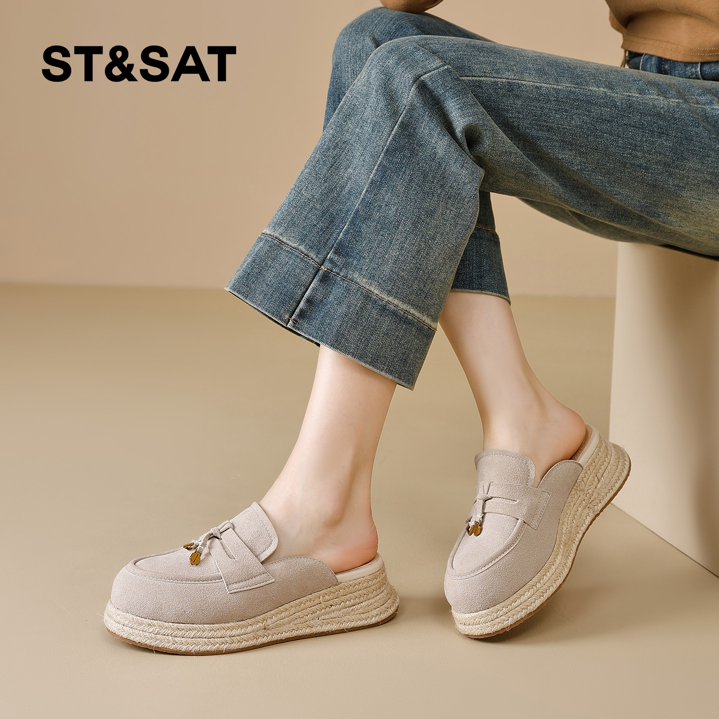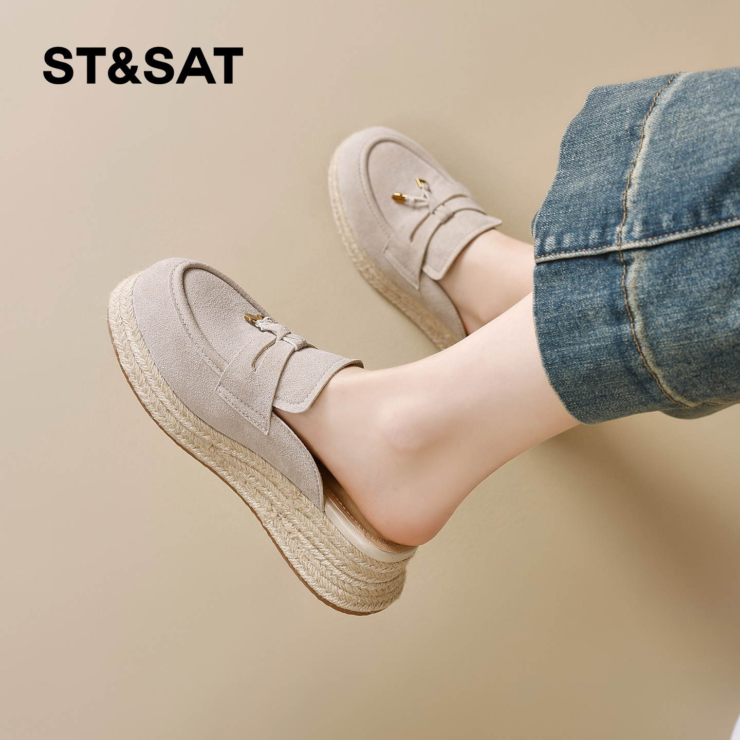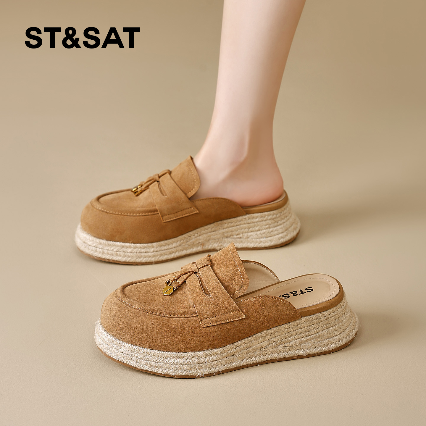 星期六草编包头半拖鞋女2025新款秋外穿厚底懒人一脚蹬复古渔夫鞋