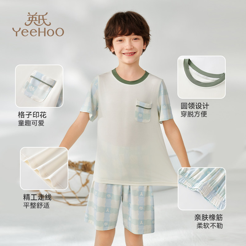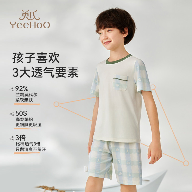 英氏男童家居服短袖短裤套装可外穿中大童女童2025夏季薄款七分裤