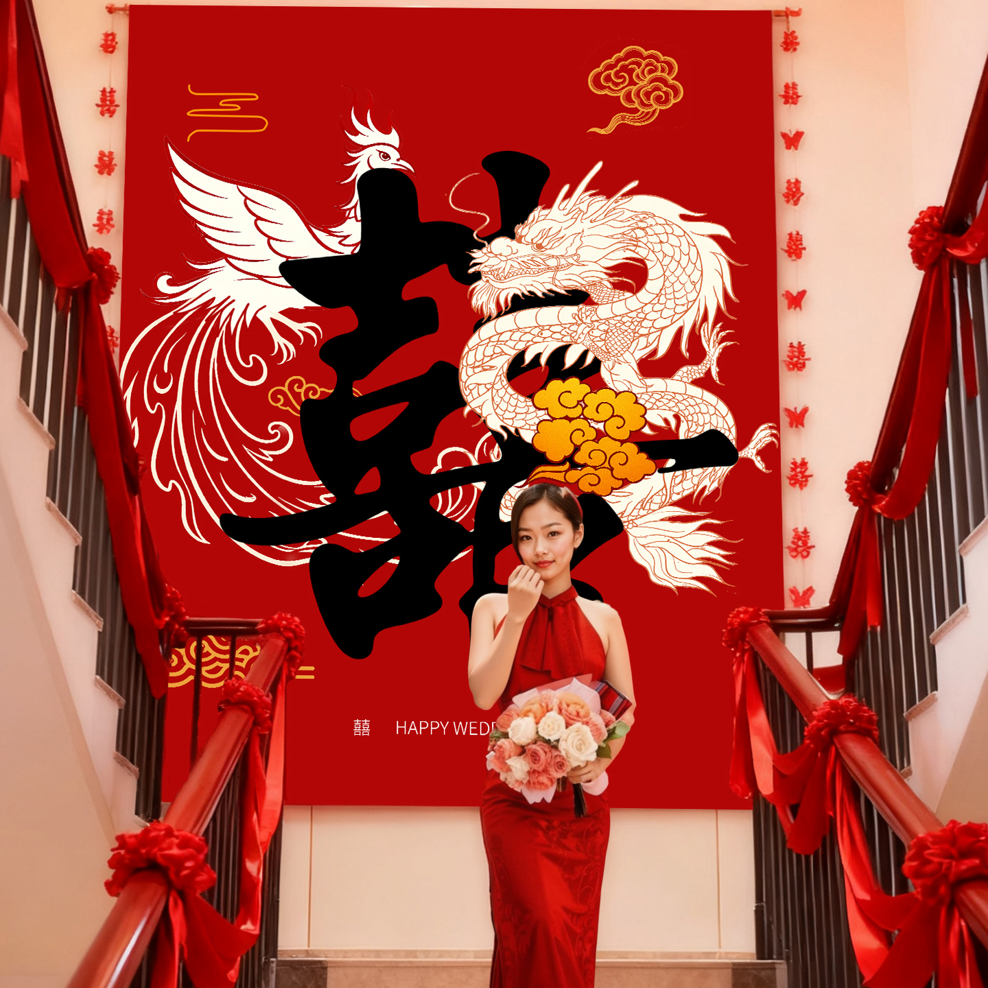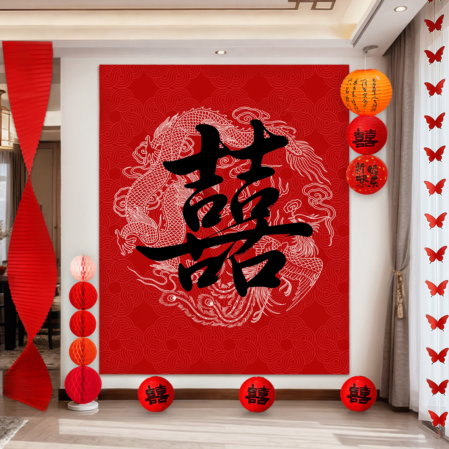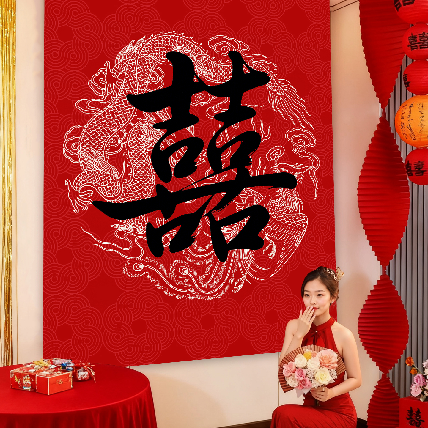 结婚布置婚房装饰龙凤超大喜字挂布结婚专用婚礼婚房打卡背景墙
