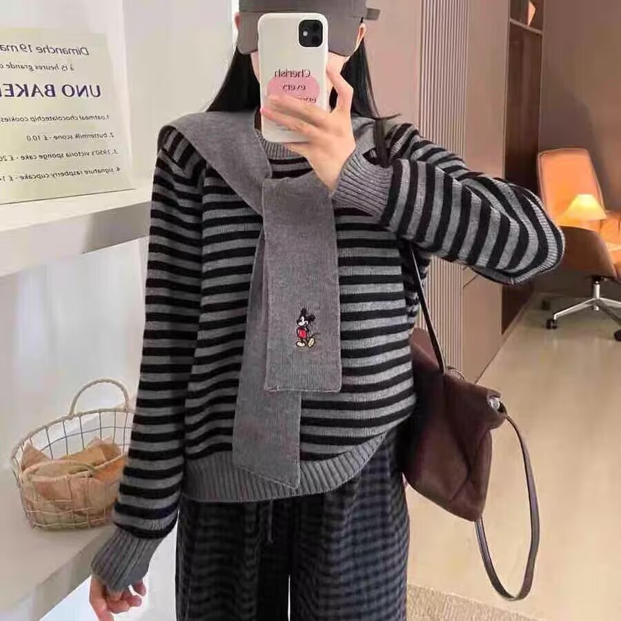 两件套时尚经典刺绣披肩条纹毛衣女秋冬韩系休闲穿搭针织衫上衣服