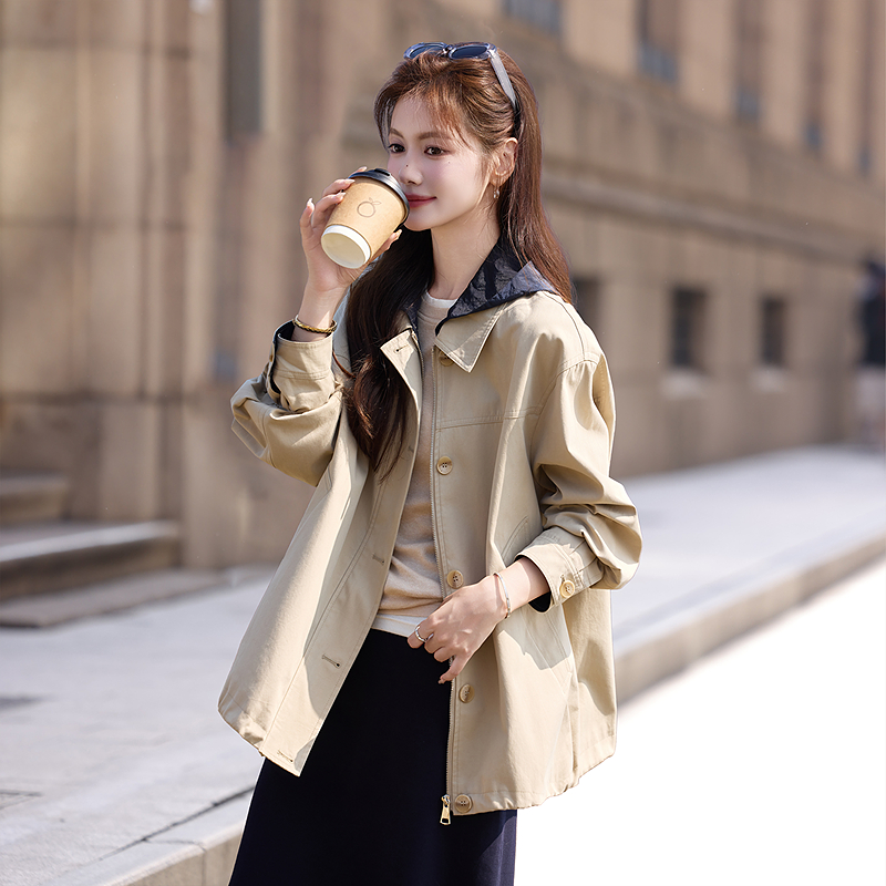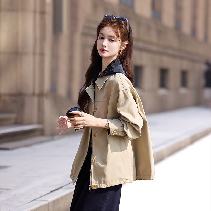 2025年秋季新款女休闲宽松中长纯棉撞色连帽中长风衣外套女装上衣