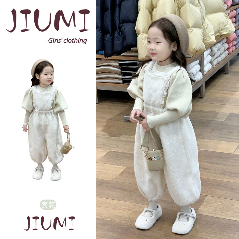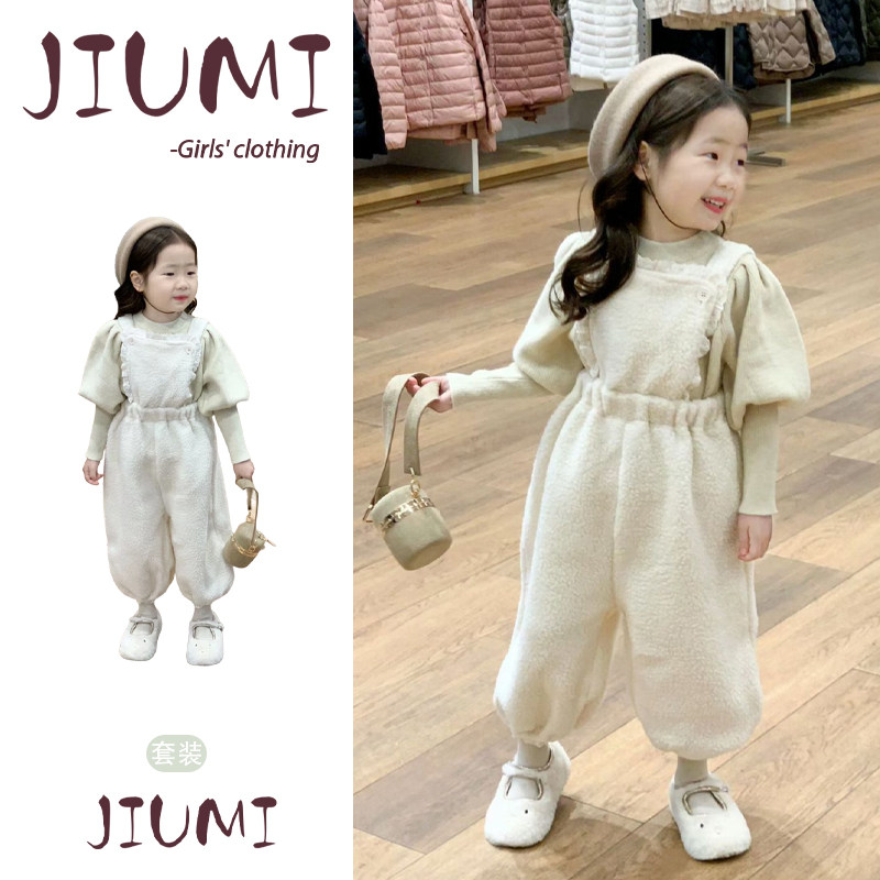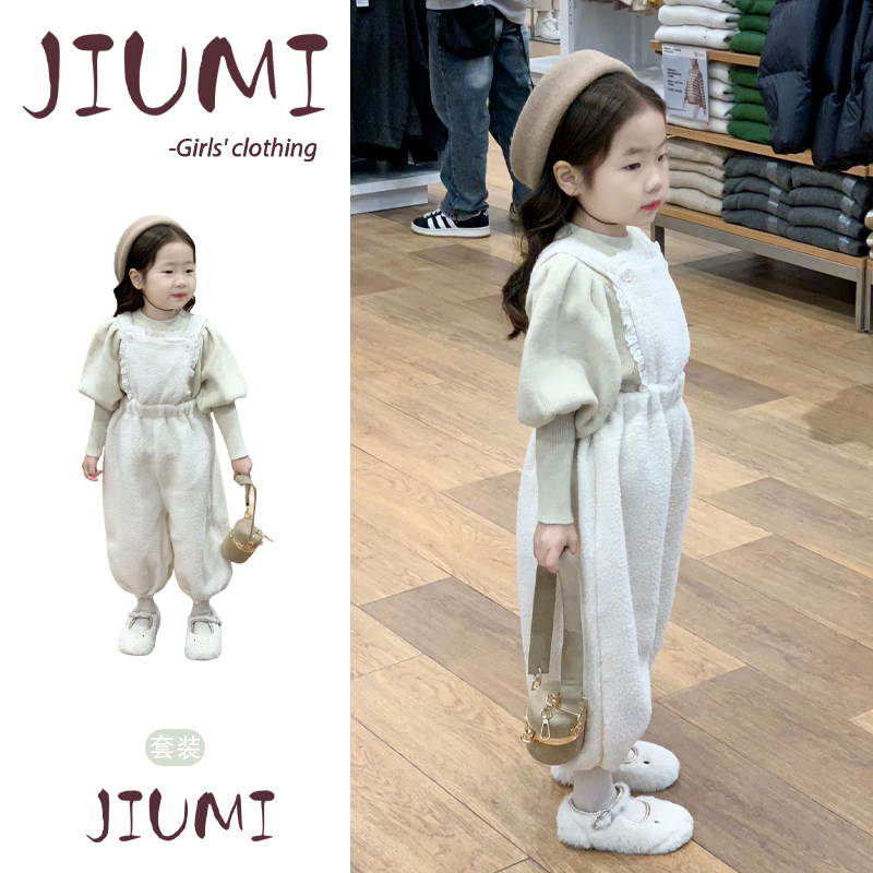女童东方既新款韩版套装女宝宝泡泡袖套头毛衣花边颗粒羊毛背带裤