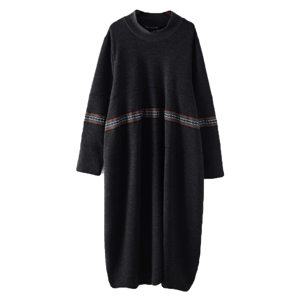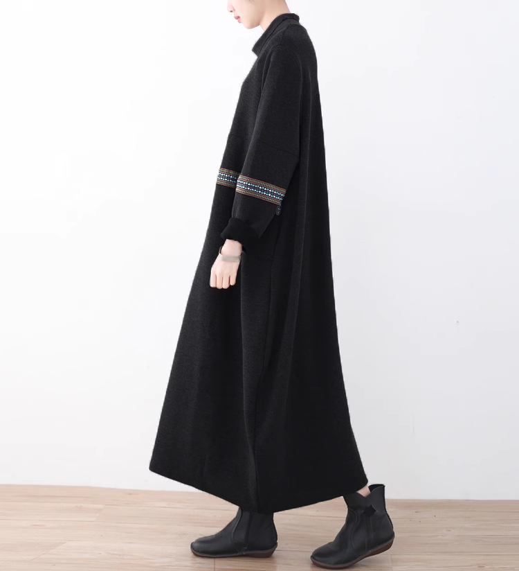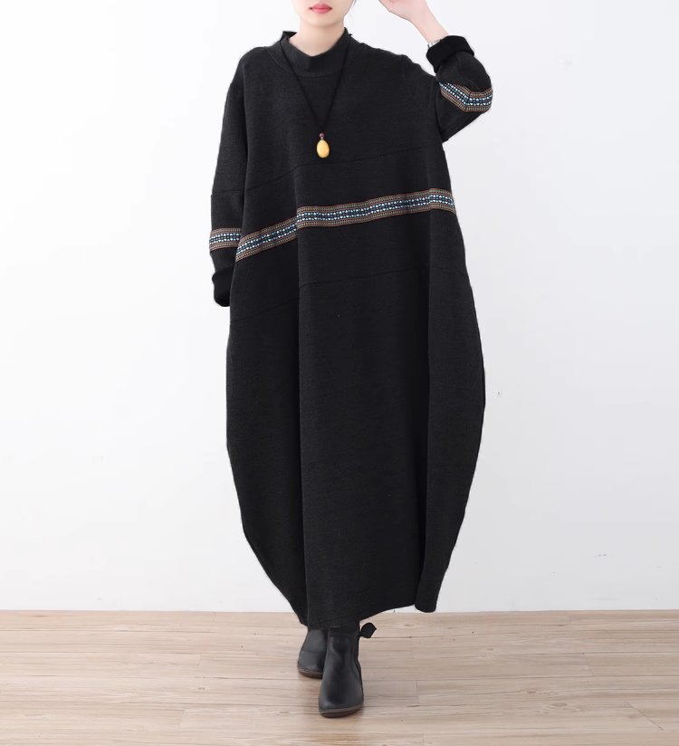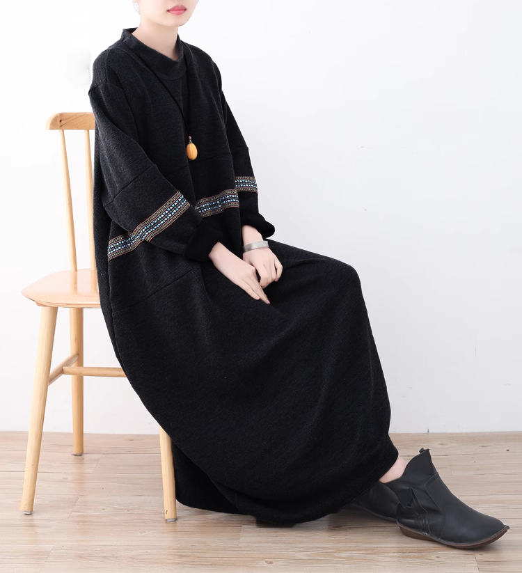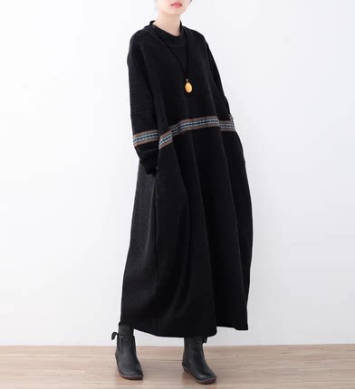 25秋冬季女装新款复古宽松高领大码绣花连衣裙拼接A字打底裙袍子