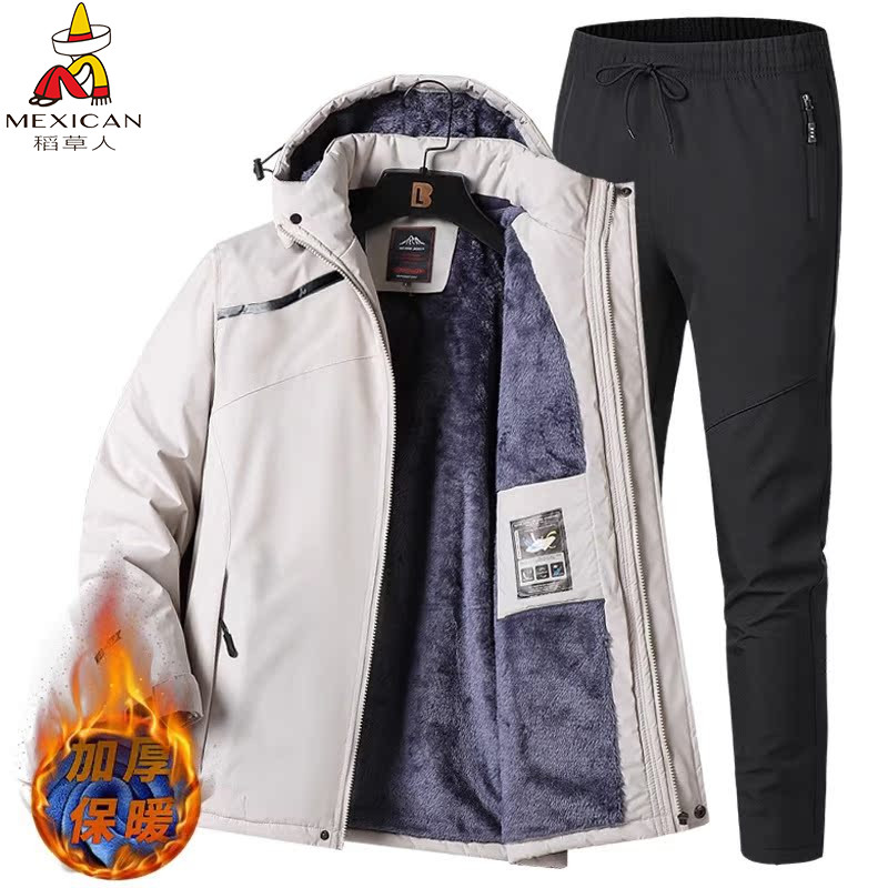 定制logo中老年男士户外冲锋衣秋冬季爸爸装加绒棉服运动套装两件
