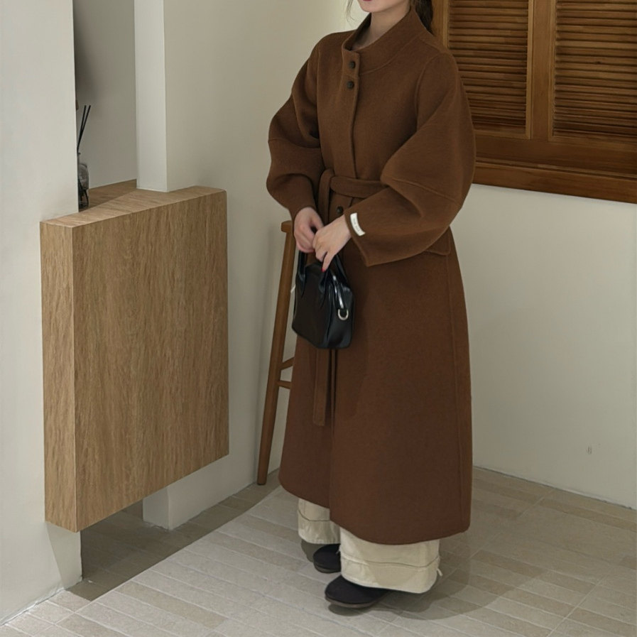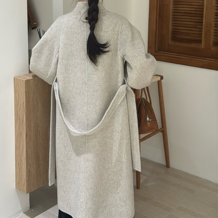 简约气质立领腰带双面羊毛大衣长款加厚保暖系带羊绒毛呢宽松外套