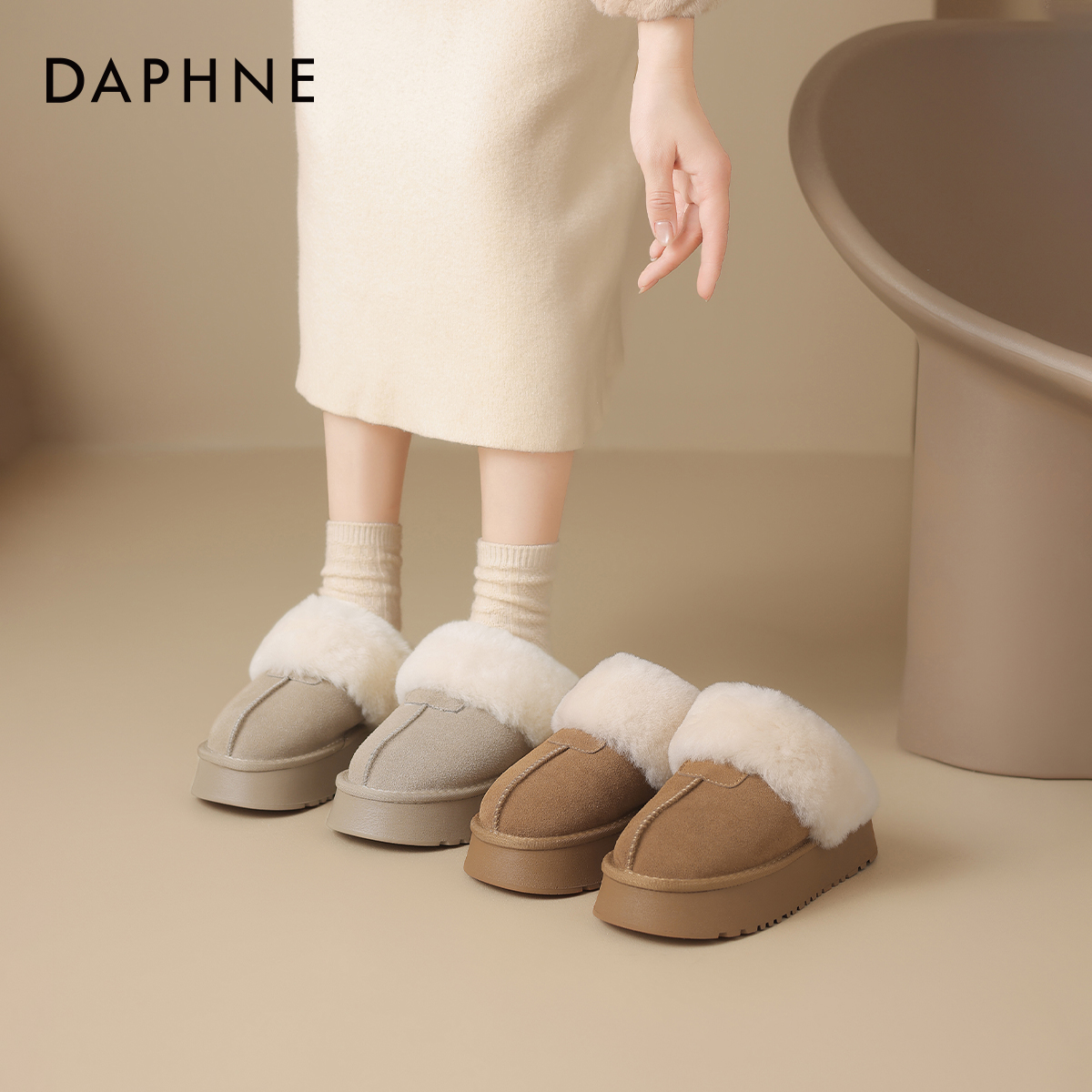 达芙妮真皮加绒棉毛毛拖鞋2025新款女士懒人鞋外穿冬季包头雪地靴