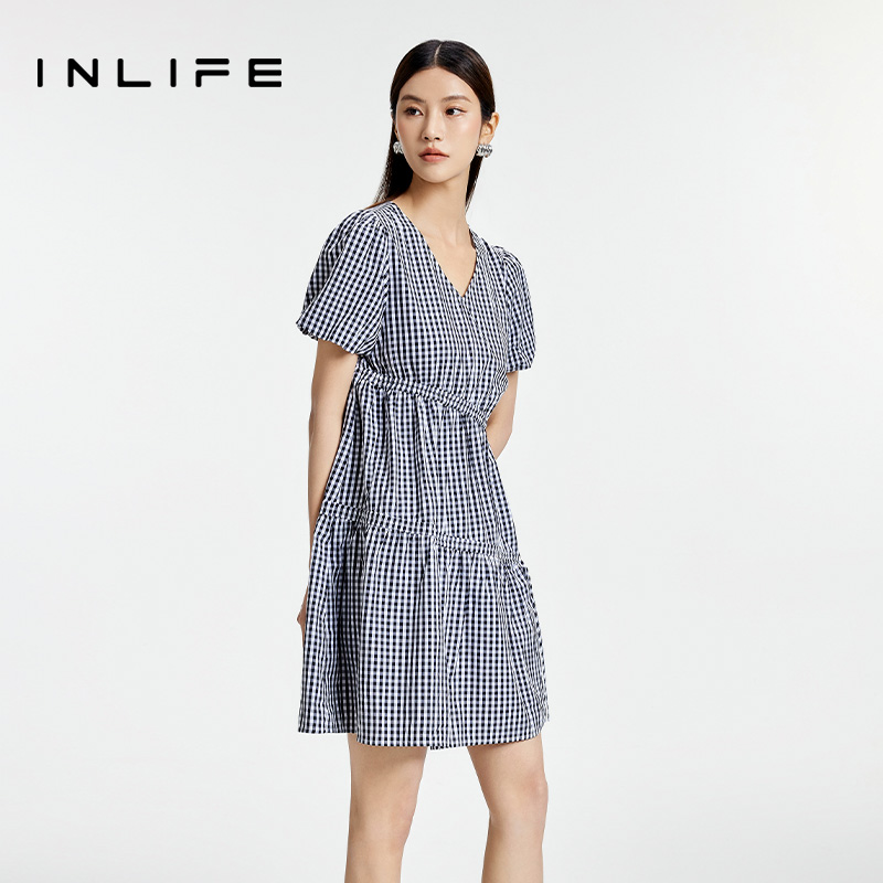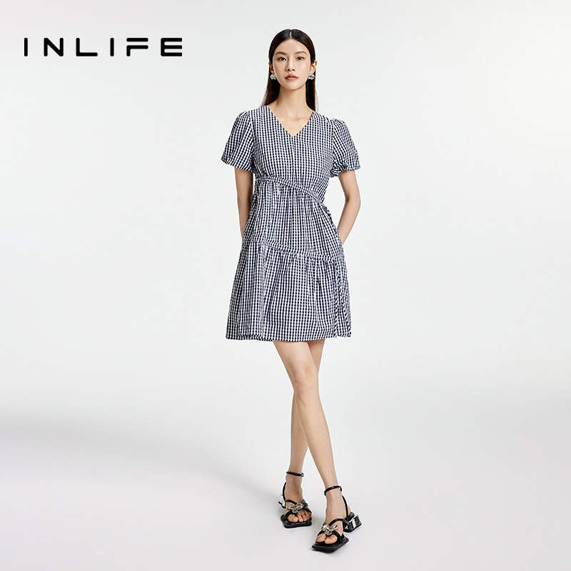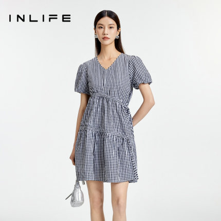 伊纳芙法式复古v领连衣裙女夏季格纹斜边设计感时尚收腰显瘦A字裙