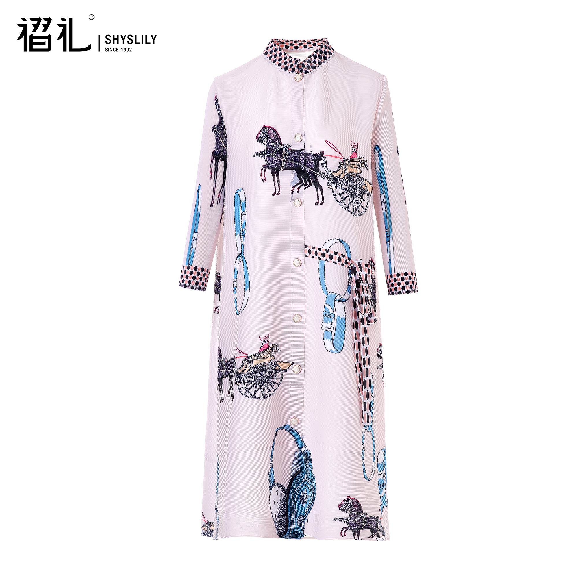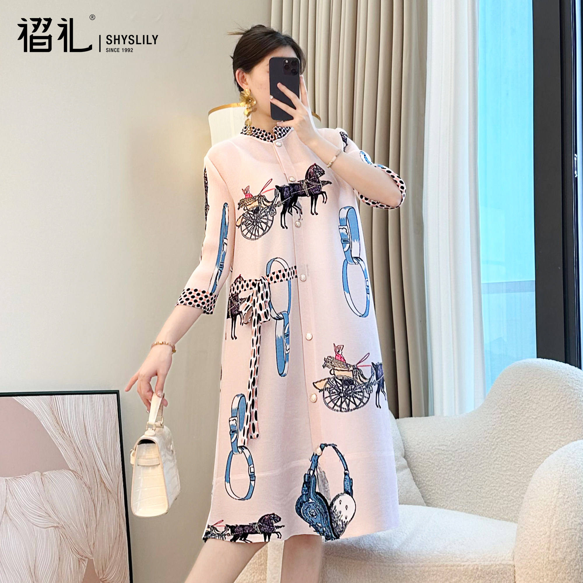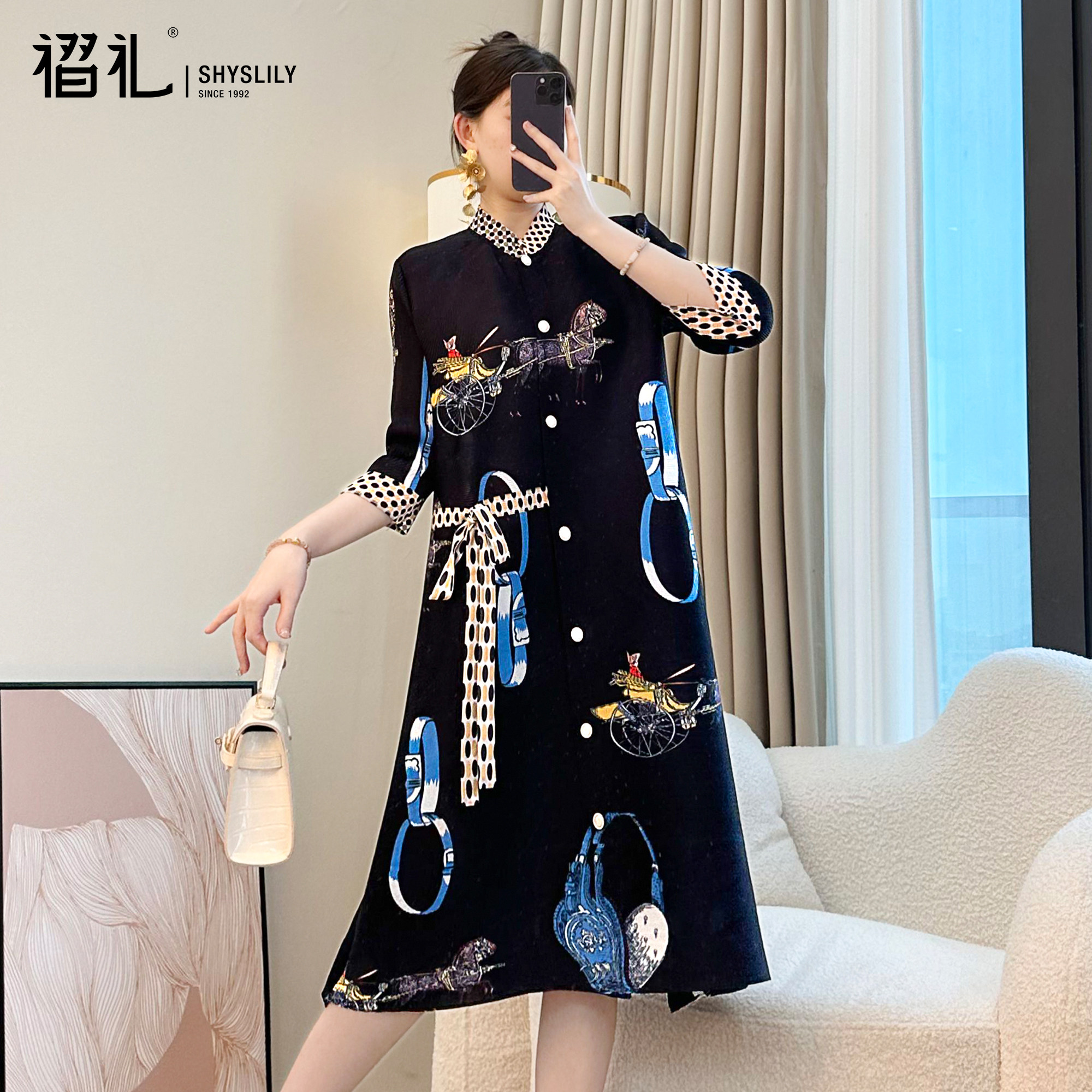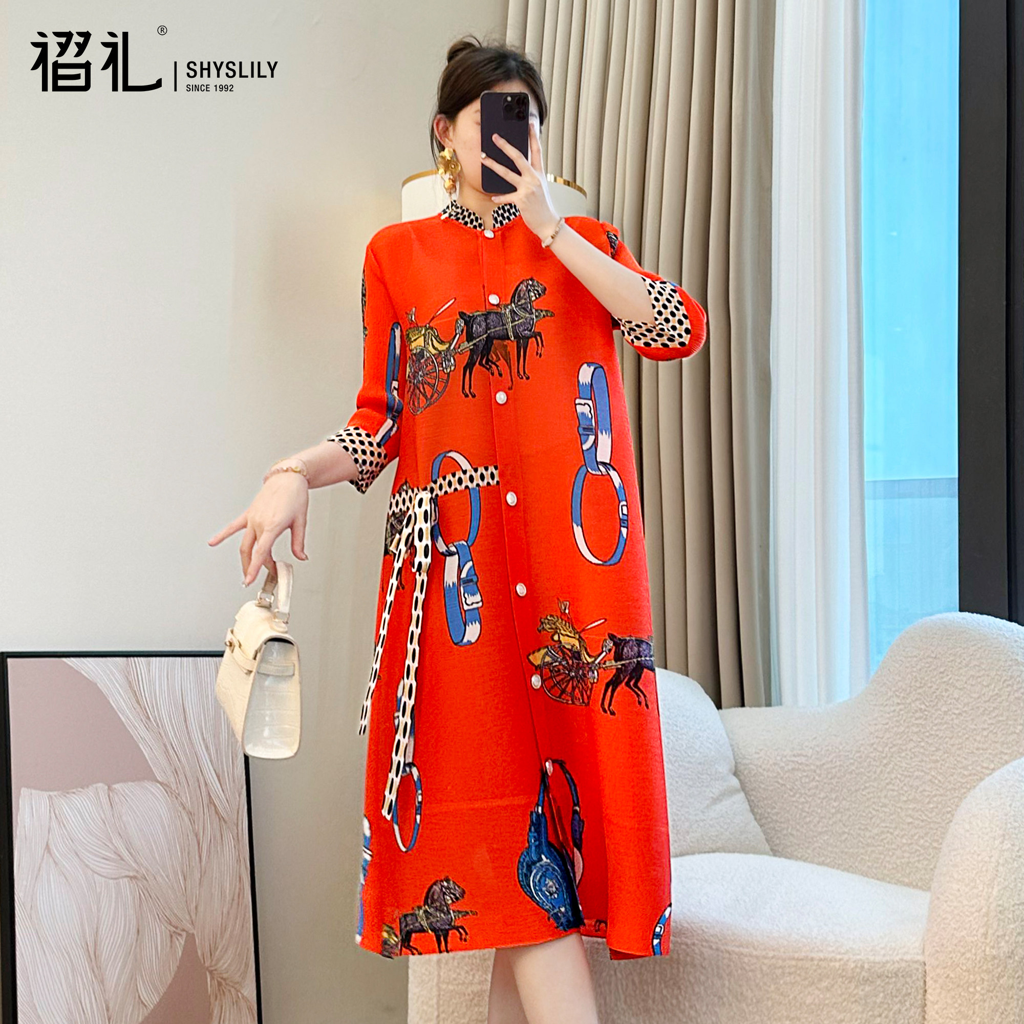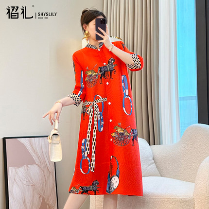 三宅印花弹簧裙洋气大码三亚海边度假妈妈春季新款褶皱红色连衣裙