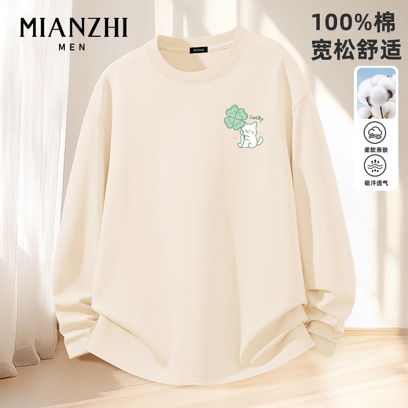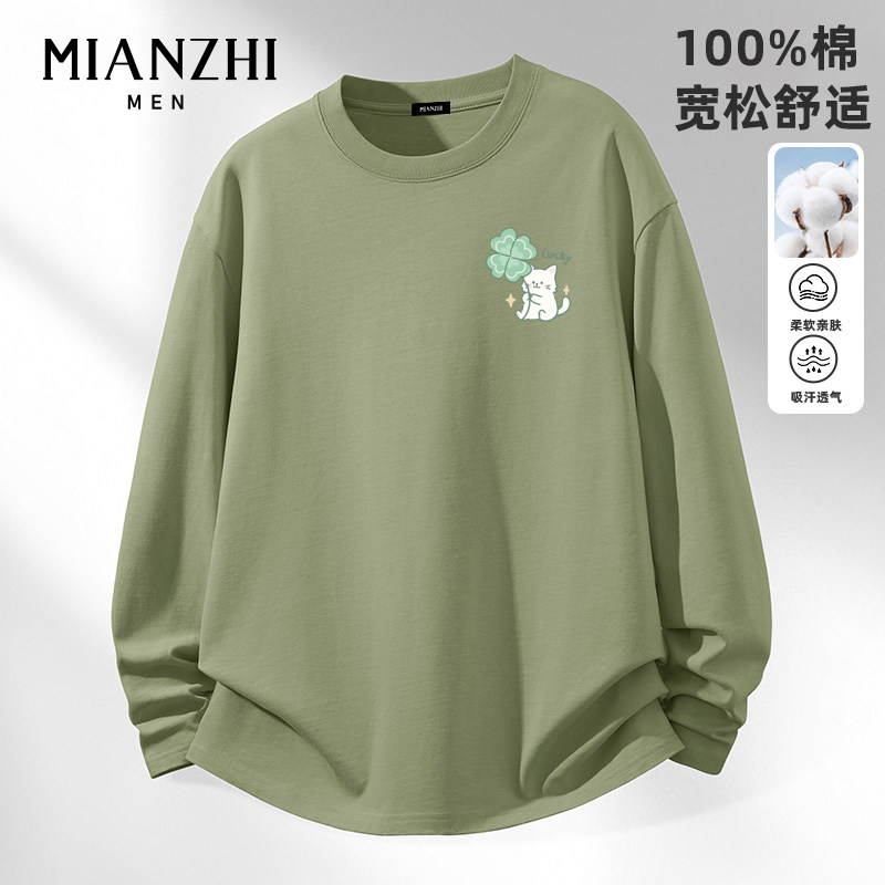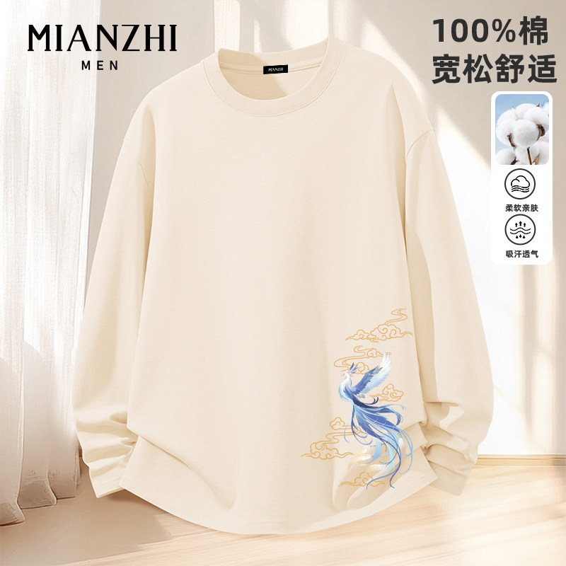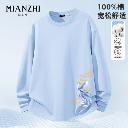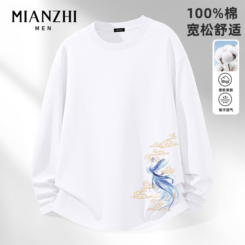 棉致国风祥云凤凰趣味纯棉长袖男款t恤春秋宽松青少年新款上衣潮