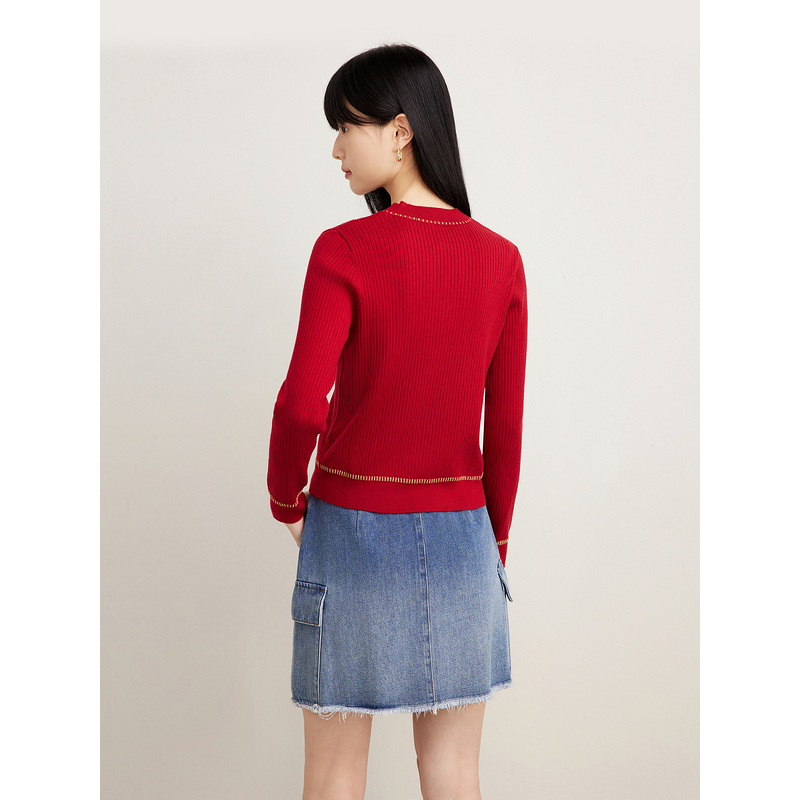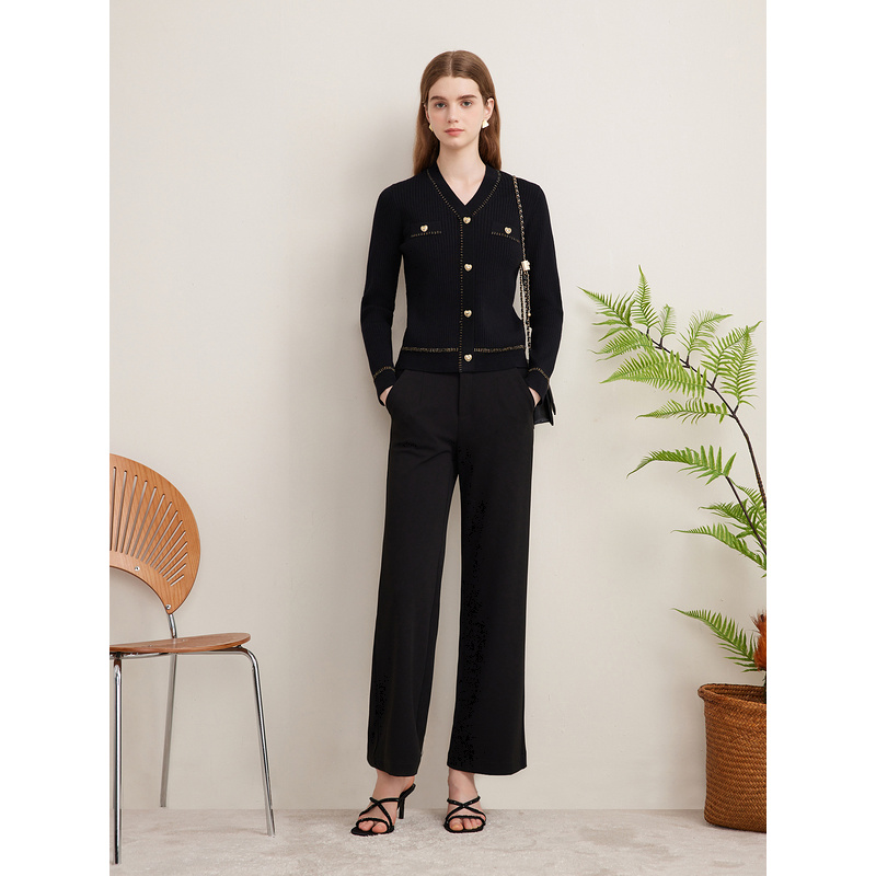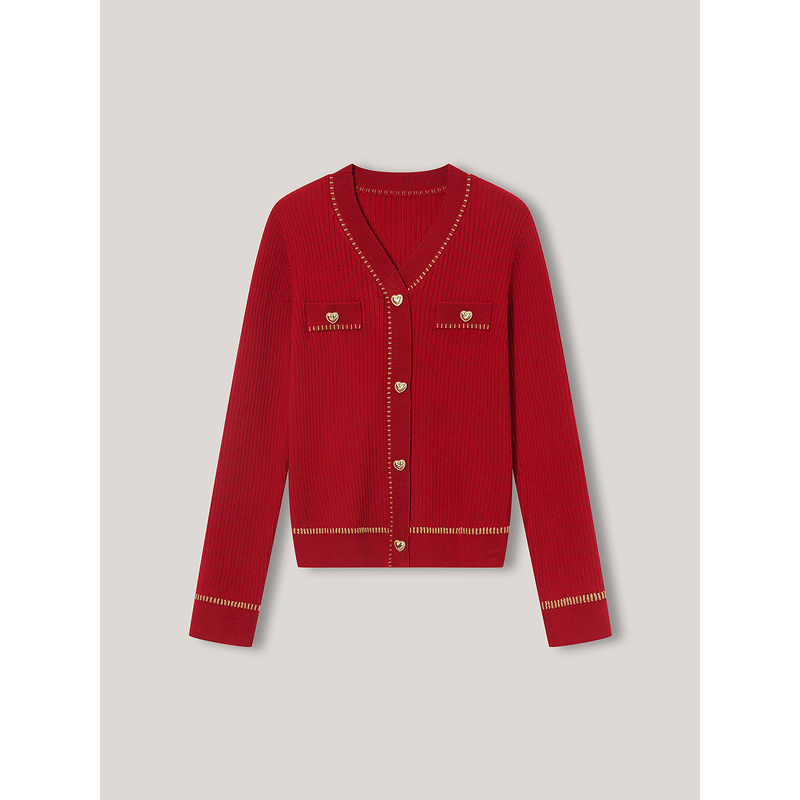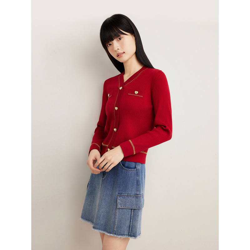 Goodland美地女装秋季时尚金属爱心扣饰V领针织开衫