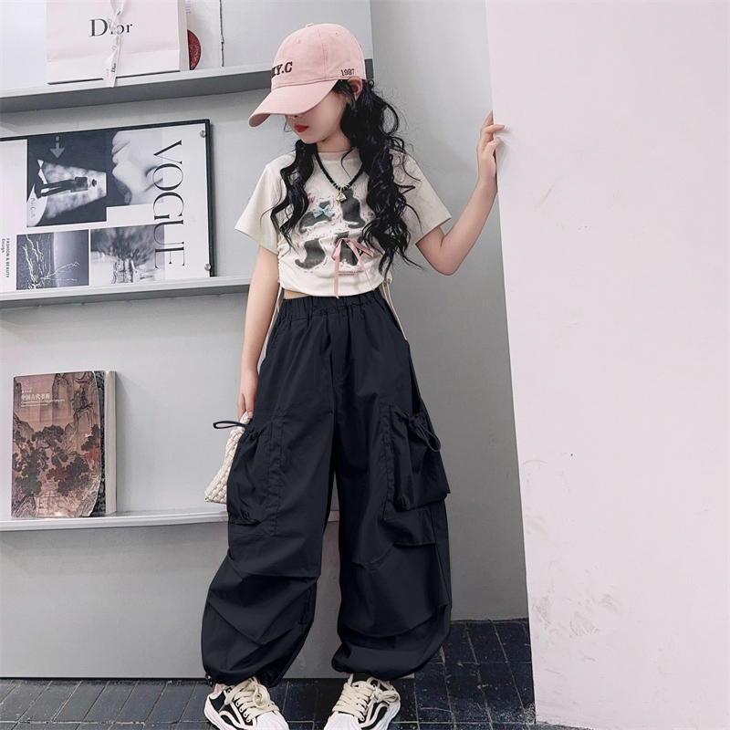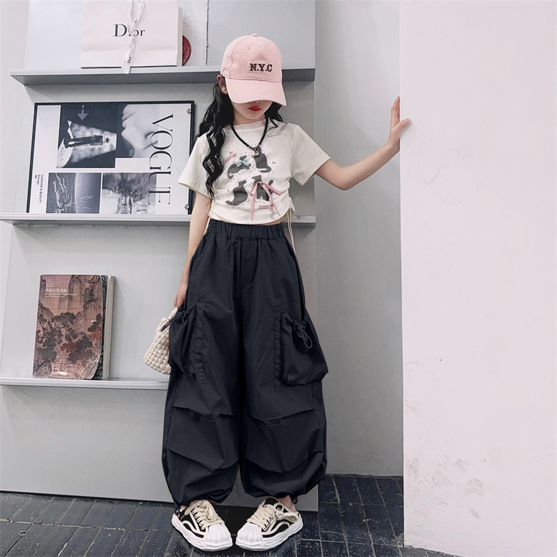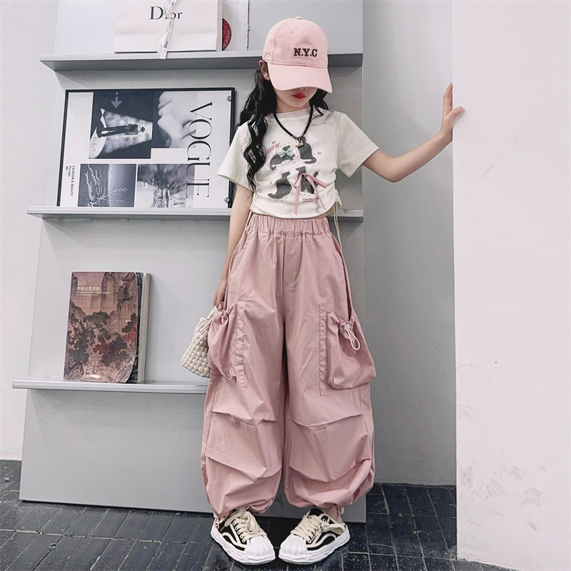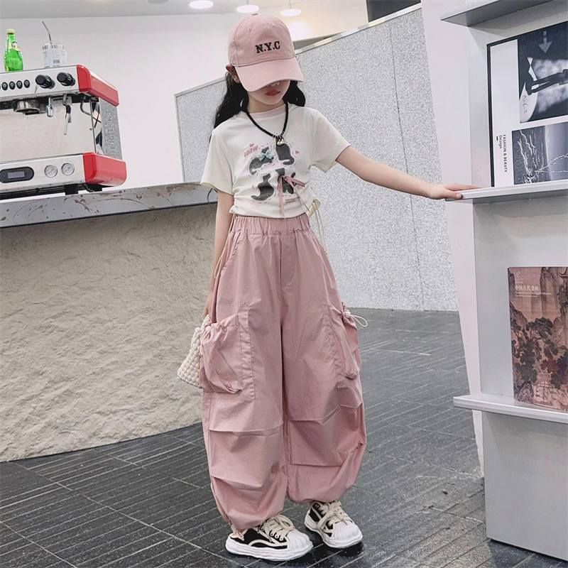 女童夏季套装2025新款洋气T恤中大童时髦百搭薄款工装裤两件套潮