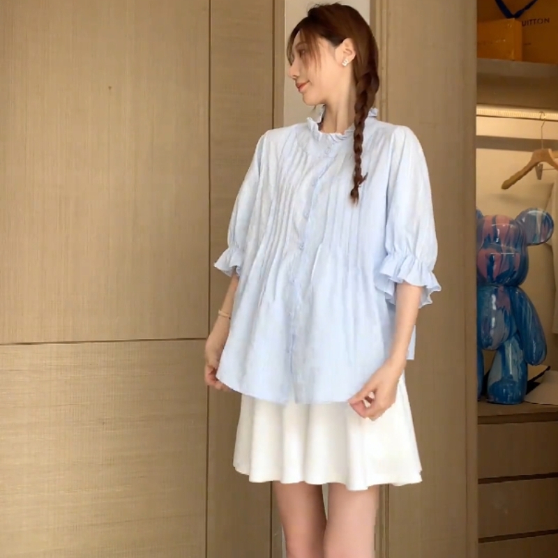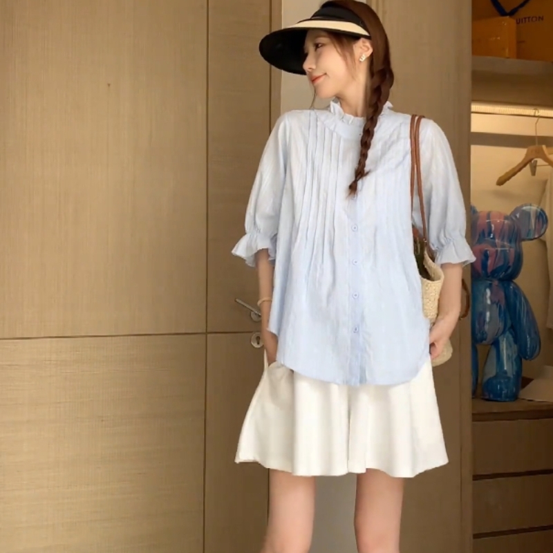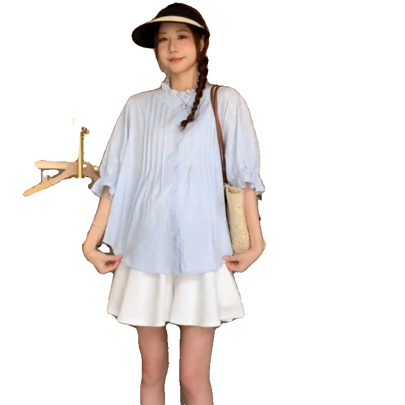 时尚孕妇装夏季韩版泡泡袖宽松法式气质娃娃领衬衫托腹短裙两件套